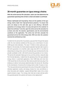 Robust, lightweight and long-lasting: these are the qualities of the igus energy chains made from high-performance polymers. To ensure that users are always on the safe side, igus is now offering a 36-month guarantee on its energy chains. It is easy and quick for the customer to obtain the certificate. To do this, open the online service life calculator for e-chains and enter the dynamic specifications and the environmental conditions of the application. The online tool will then calculate the guaranteed service life of the energy chain. With one click, the customer receives the certificate by e-mail.
