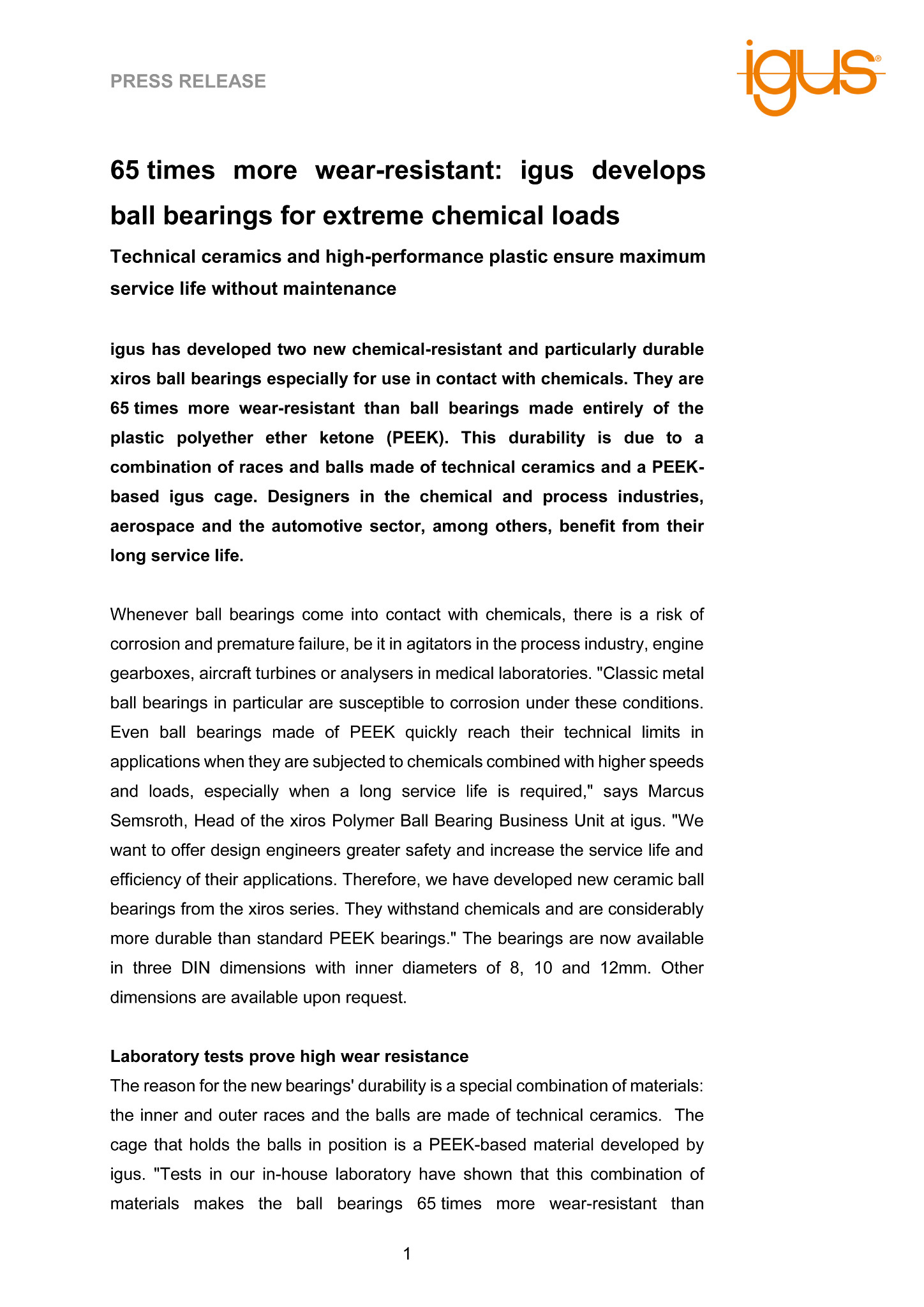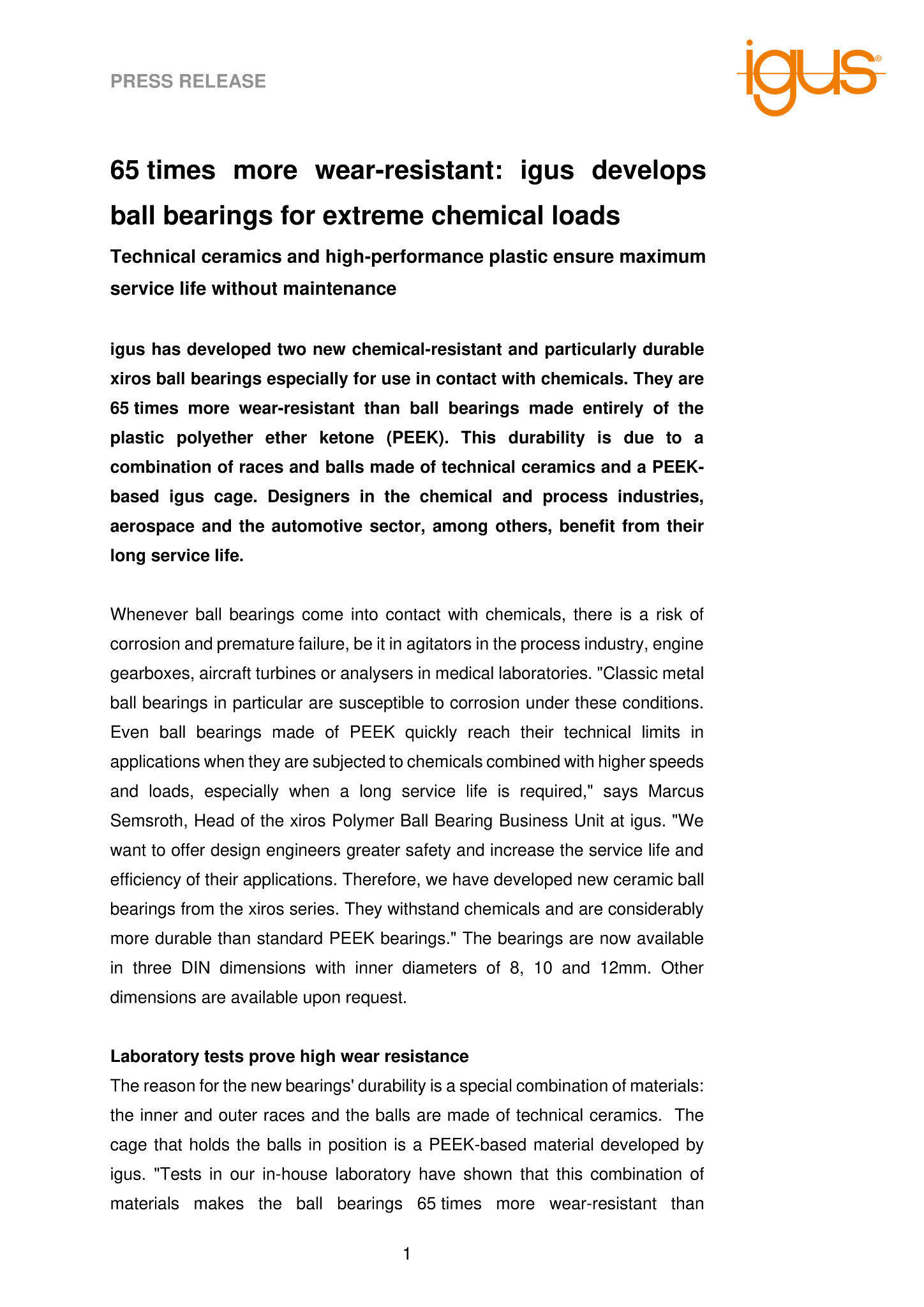 igus has developed two new chemical-resistant and particularly durable xiros ball bearings especially for use in contact with chemicals. They are 65 times more wear-resistant than ball bearings made entirely of the plastic polyether ether ketone (PEEK). This durability is due to a combination of races and balls made of technical ceramics and a PEEK-based igus cage. Designers in the chemical and process industries, aerospace and the automotive sector, among others, benefit from their long service life.