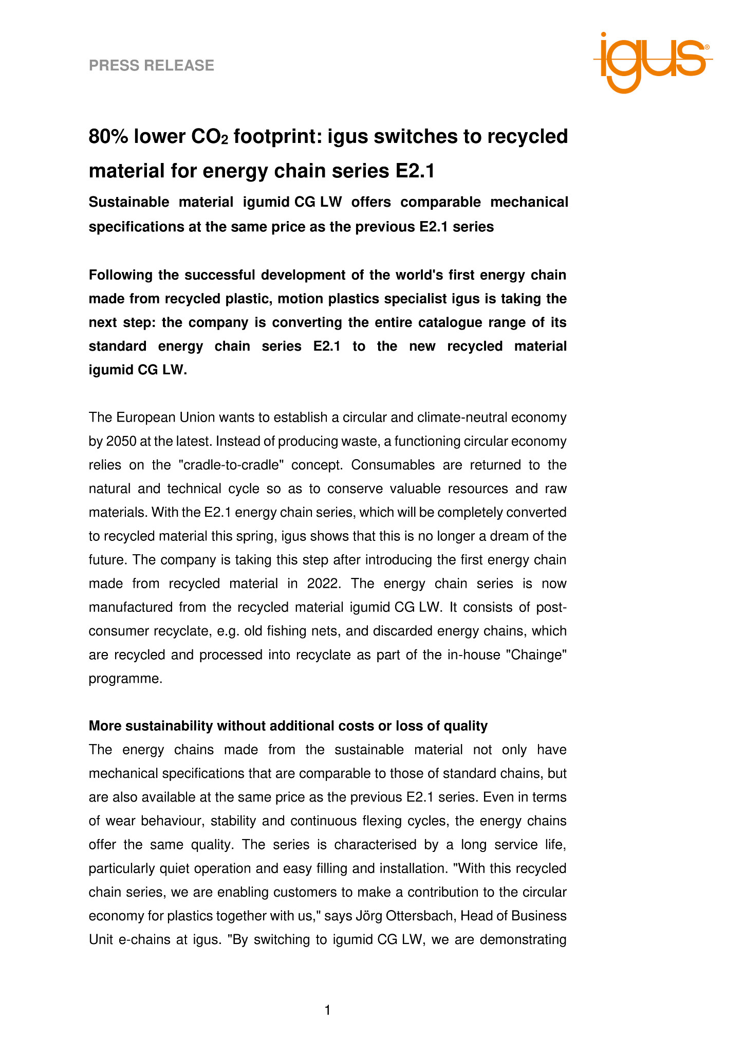 The energy chains made from the sustainable material not only have mechanical specifications that are comparable to those of standard chains, but are also available at the same price as the previous E2.1 series. Even in terms of wear behaviour, stability and continuous flexing cycles, the energy chains offer the same quality. The series is characterised by a long service life, particularly quiet operation and easy filling and installation. “With this recycled chain series, we are enabling customers to make a contribution to the circular economy for plastics together with us,” says Jörg Ottersbach, Head of Business Unit e-chains at igus. “By switching to igumid CG LW, we are demonstrating that circular economy and cost-effectiveness are by no means mutually exclusive.”