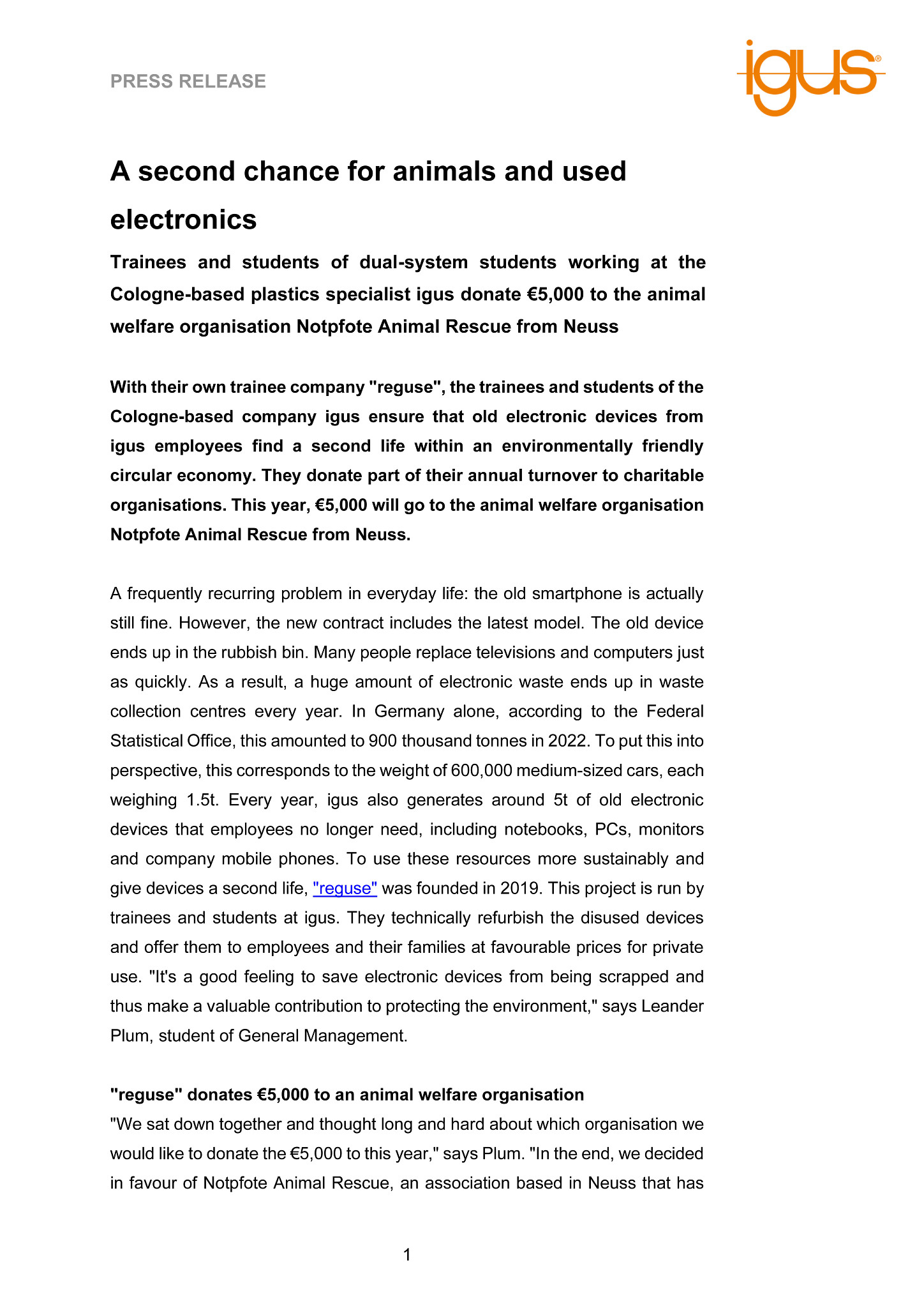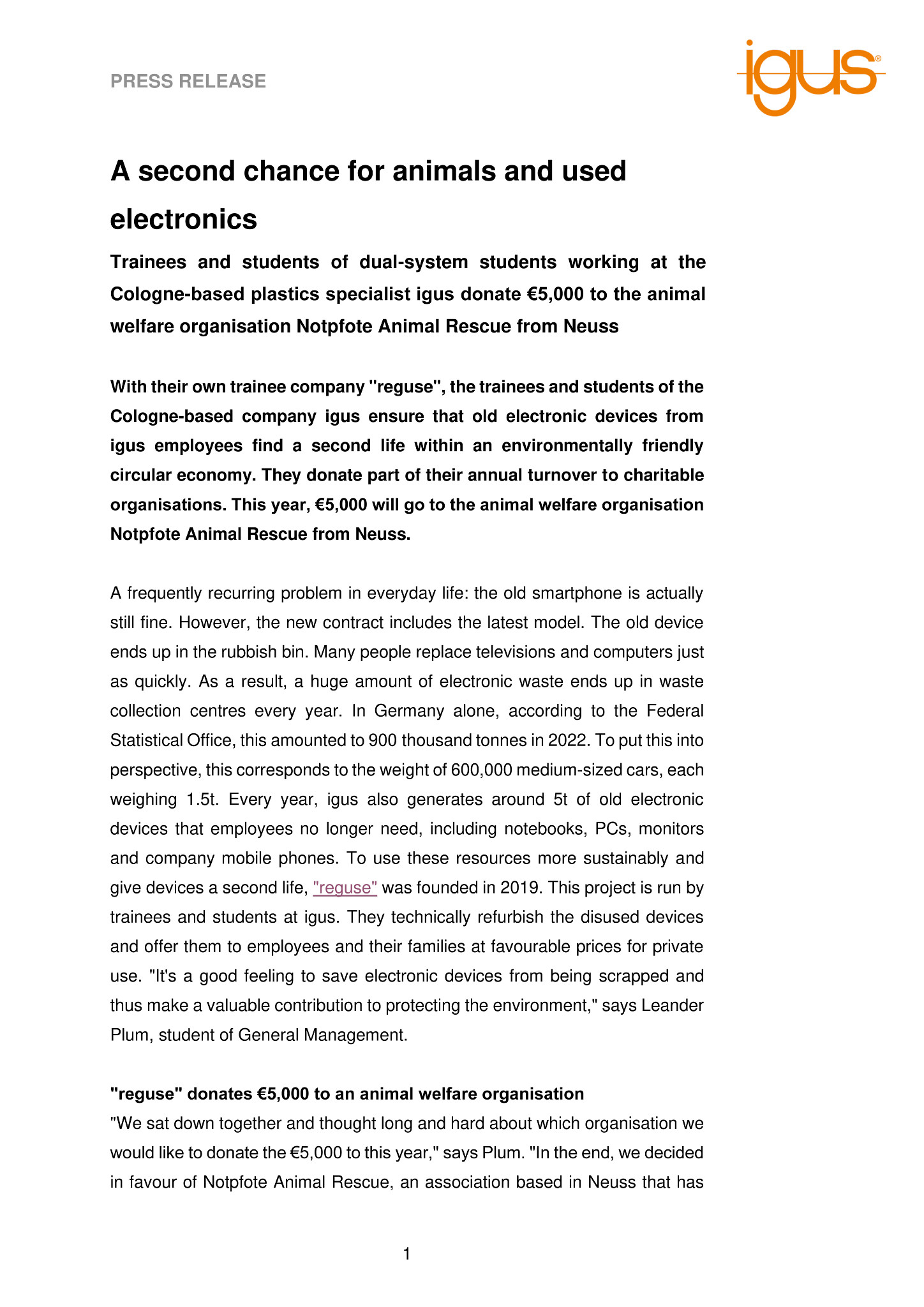 With their own trainee company “reguse”, the trainees and students of the Cologne-based company igus ensure that old electronic devices from igus employees find a second life within an environmentally friendly circular economy. They donate part of their annual turnover to charitable organisations. This year, €5,000 will go to the animal welfare organisation Notpfote Animal Rescue from Neuss.