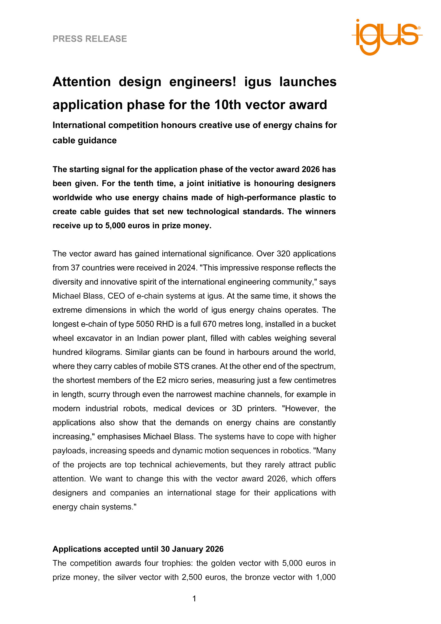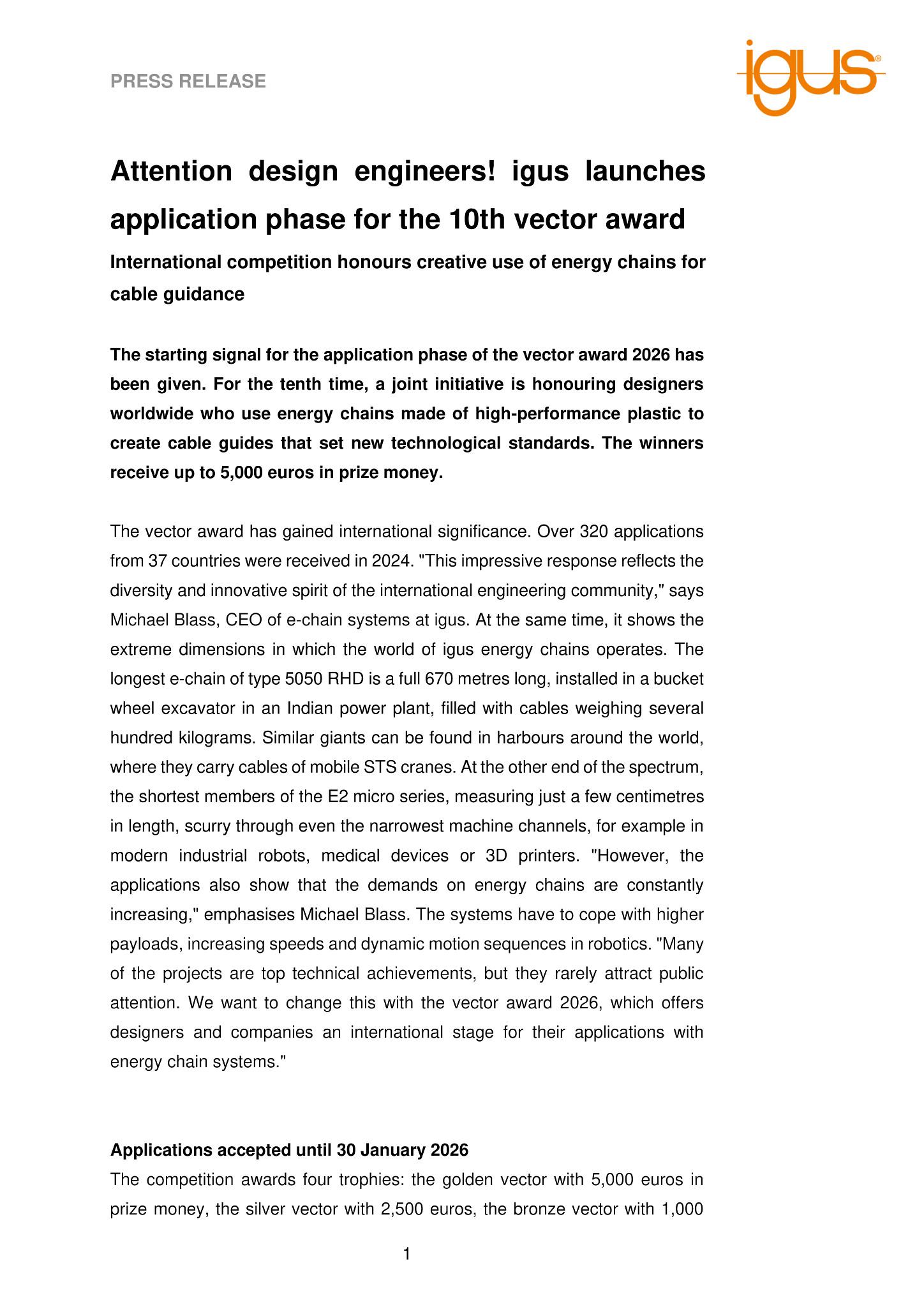 The competition awards four trophies: the golden vector with 5,000 euros in prize money, the silver vector with 2,500 euros, the bronze vector with 1,000 euros and the green vector for exceptionally sustainable solutions, also worth 1,000 euros. The application phase for the 10th vector award starts on 6 October 2025. All design engineers who use energy chains made of high-performance plastic or plastic hybrid solutions from igus are eligible to take part. The projects must not be in the planning stage, but must already have been successfully implemented. The closing date for entries is 30 January 2026. An independent jury of experts from research, the specialist press and the industry will then meet in Cologne on 26 February to select the winners. The winners will be announced on 8 April 2026.