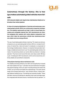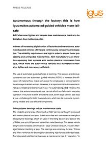 In times of increasing digitalisation of factories and warehouses, au-tomated guided vehicles (AGVs) are continuously conquering intralo-gistics. The reliability requirements are high in order to ensure faster processing and unimpeded material flow. AGV manufacturers are therefore equipping their systems with motion plastics components from igus, which make the autonomous vehicles less maintenance-intensive, lighter and more energy-efficient.