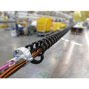 To guide cables safely in hanging applications, igus has developed the e-loop as an alternative to the service loop. This is because the service loop often causes a number of problems: the cables have no guide, have no defined bend radius, cannot move and, in the worst case, break. When servicing or repairing the service loop, the complete system must be replaced, as the cables are sealed together. “With the e-loop we have developed an alternative to the service loop. The three-dimensional energy supply system combines the advantages of a polymer energy chain with a high-strength pull rope. The rope absorbs the tensile forces inside the chain and transmits them to the mounting brackets. This means that the cables remain completely strain-relieved”, says Tim Schneebeck, Industry Manager Oil & Gas at igus GmbH. The modular e-chain made of high-performance polymer offers a defined bend radius at all times and withstands vibrations and shocks thanks to PU protectors.