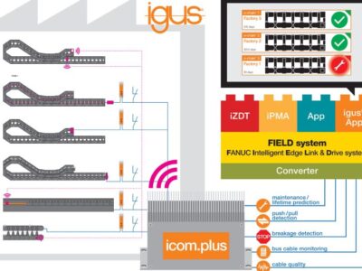 In order to be able to evaluate data from machines and systems centrally, Fanuc is now presenting its new open industrial IoT platform called “FIELD system”. The system can connect production machines of all manufacturers by means of a local network topology, enabling comprehensive data analysis of the entire process chain. In this infrastructure, apps from Fanuc and also from third-party suppliers are used. Now, igus has developed a smart plastics app for the new system. The app can be used by maintenance personnel to monitor the condition of their igus components, for example, energy chains and cables and plan all their maintenance work in good time.