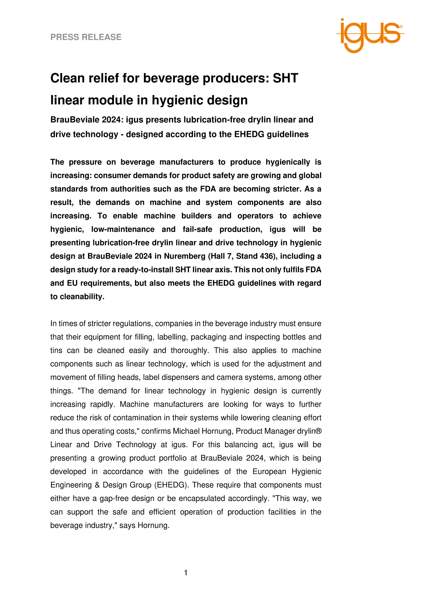 The pressure on beverage manufacturers to produce hygienically is increasing: consumer demands for product safety are growing and global standards from authorities such as the FDA are becoming stricter. As a result, the demands on machine and system components are also increasing. To enable machine builders and operators to achieve hygienic, low-maintenance and fail-safe production, igus will be presenting lubrication-free drylin linear and drive technology in hygienic design at BrauBeviale 2024 in Nuremberg (Hall 7, Stand 436), including a design study for a ready-to-install SHT linear axis. This not only fulfils FDA and EU requirements, but also meets the EHEDG guidelines with regard to cleanability.