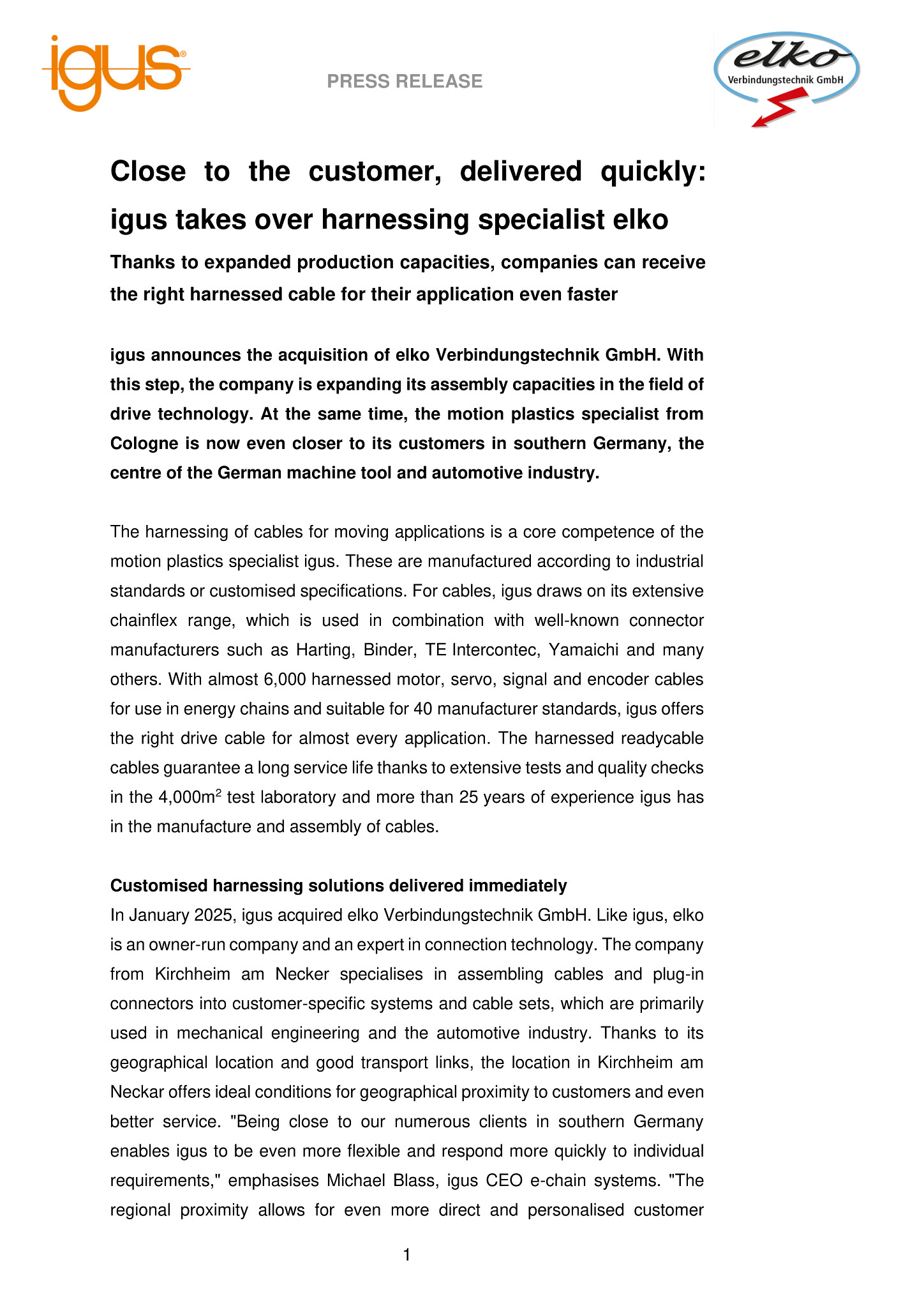 igus announces the acquisition of elko Verbindungstechnik GmbH. With this step, the company is expanding its assembly capacities in the field of drive technology. At the same time, the motion plastics specialist from Cologne is now even closer to its customers in southern Germany, the centre of the German machine tool and automotive industry.