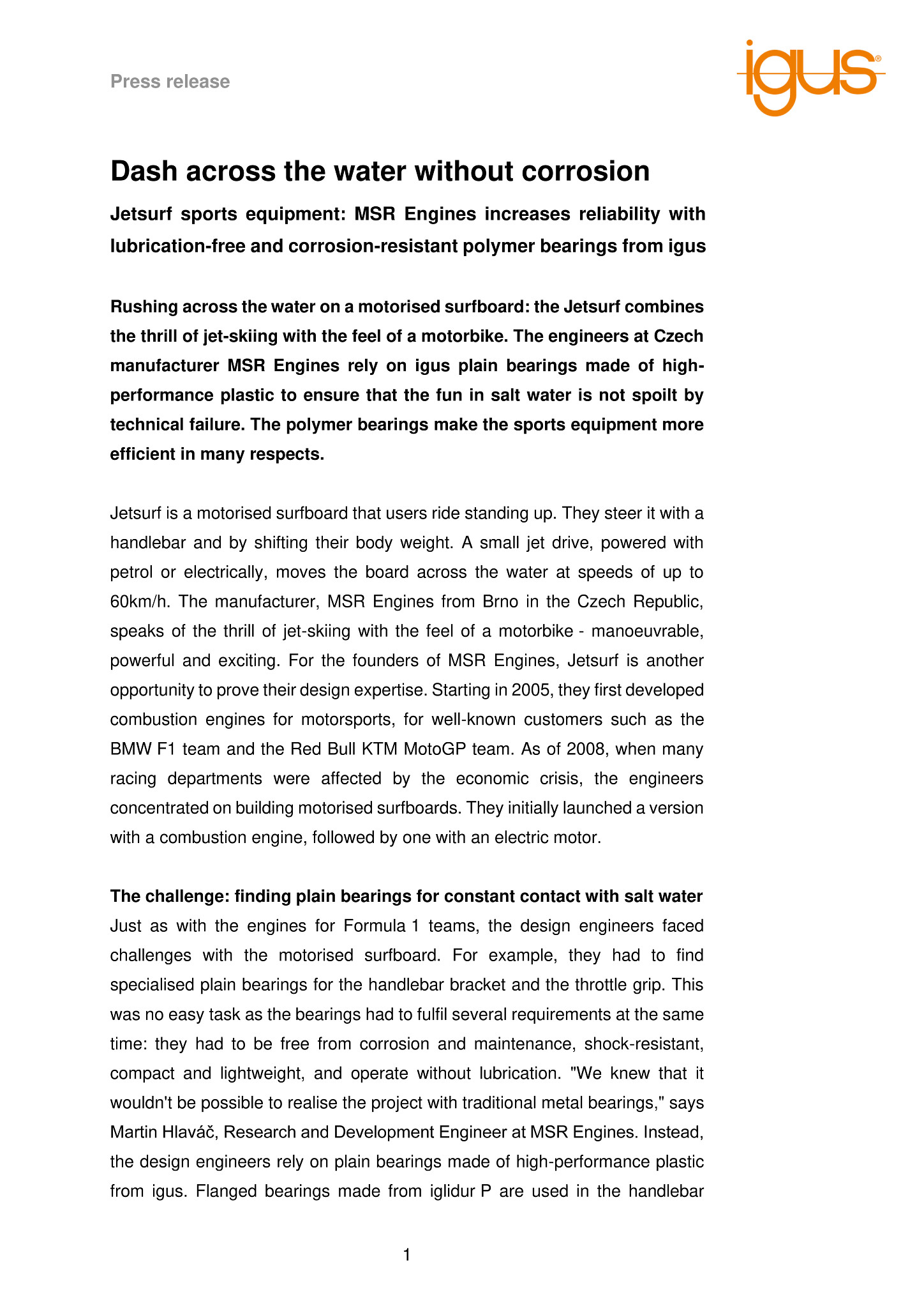 Rushing across the water on a motorised surfboard: the Jetsurf combines the thrill of jet-skiing with the feel of a motorbike. The engineers at Czech manufacturer MSR Engines rely on igus plain bearings made of high-performance plastic to ensure that the fun in salt water is not spoilt by technical failure. The polymer bearings make the sports equipment more efficient in many respects.