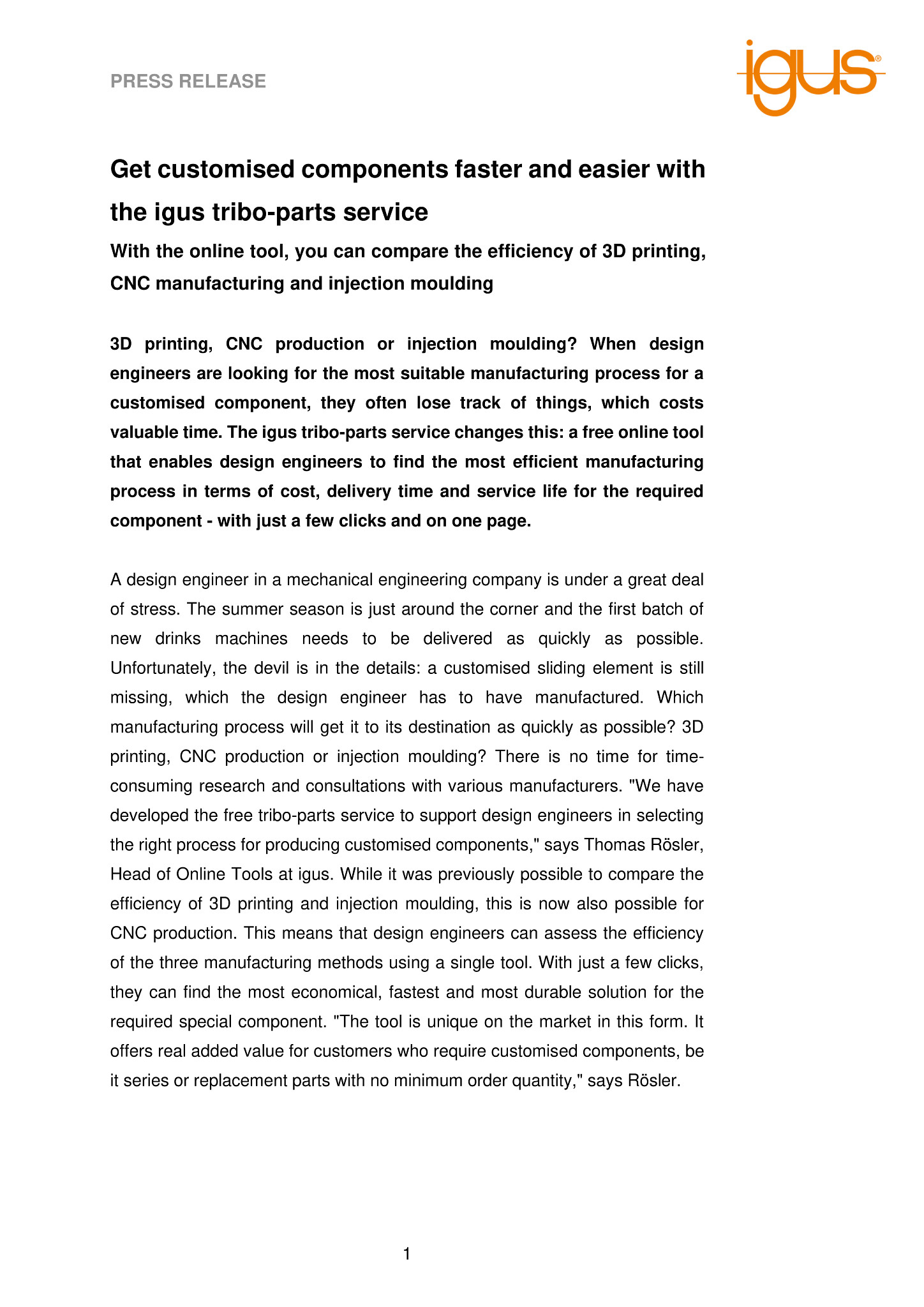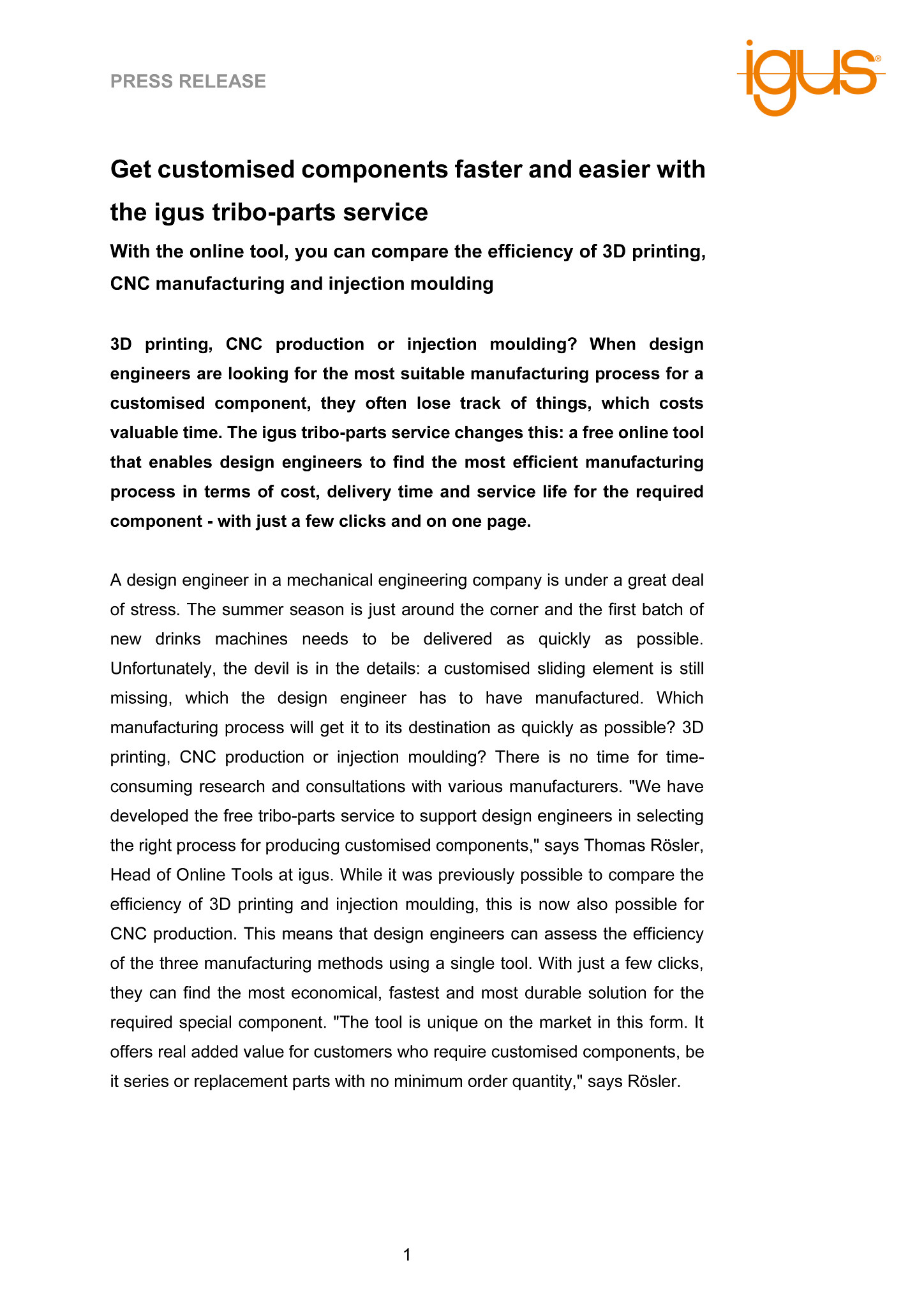 A design engineer in a mechanical engineering company is under a great deal of stress. The summer season is just around the corner and the first batch of new drinks machines needs to be delivered as quickly as possible. Unfortunately, the devil is in the details: a customised sliding element is still missing, which the design engineer has to have manufactured. Which manufacturing process will get it to its destination as quickly as possible? 3D printing, CNC production or injection moulding? There is no time for time-consuming research and consultations with various manufacturers. “We have developed the free tribo-parts service to support design engineers in selecting the right process for producing customised components,” says Thomas Rösler, Head of Online Tools at igus. While it was previously possible to compare the efficiency of 3D printing and injection moulding, this is now also possible for CNC production. This means that design engineers can assess the efficiency of the three manufacturing methods using a single tool. With just a few clicks, they can find the most economical, fastest and most durable solution for the required special component. “The tool is unique on the market in this form. It offers real added value for customers who require customised components, be it series or replacement parts with no minimum order quantity,” says Rösler.