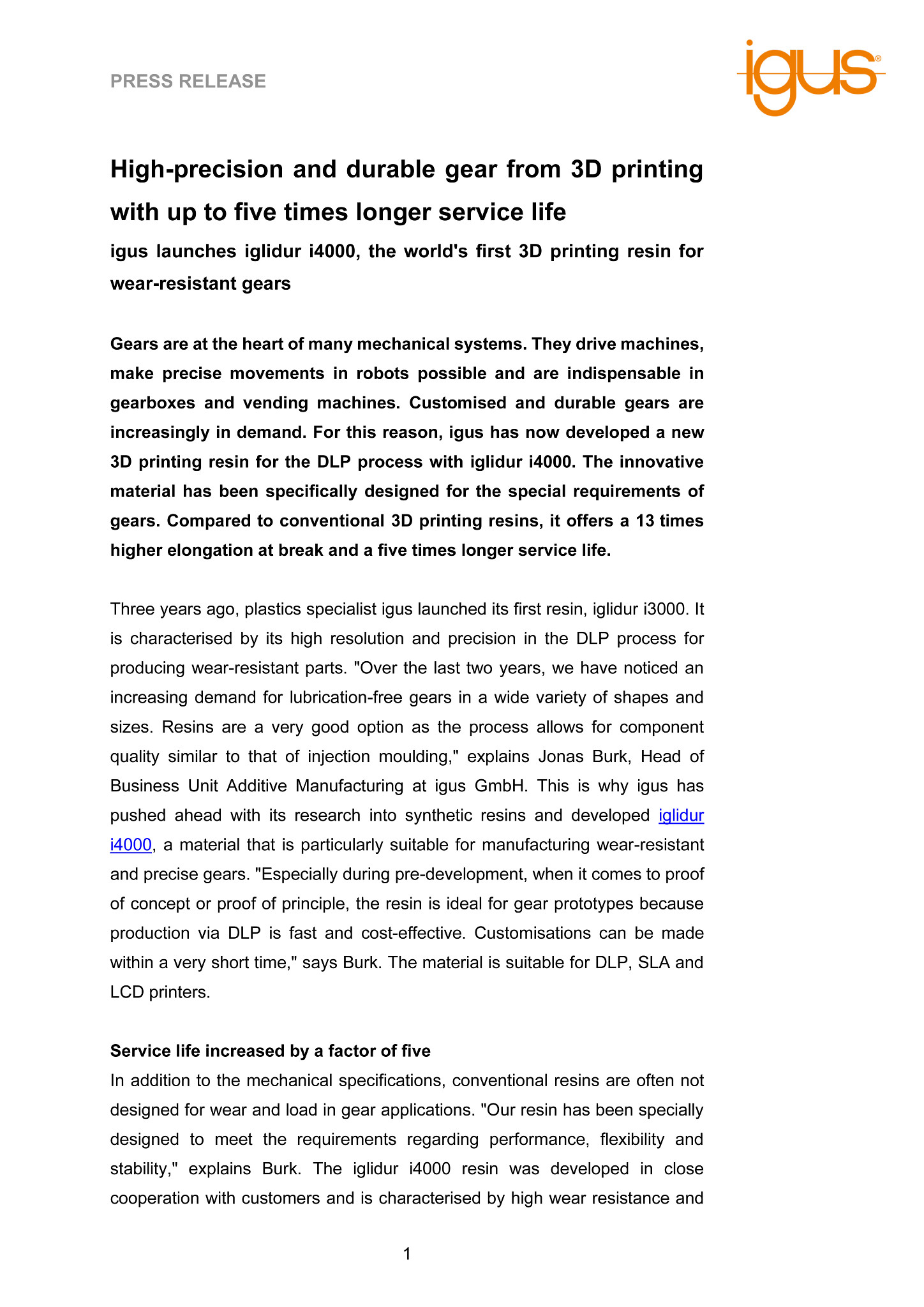 Three years ago, plastics specialist igus launched its first resin, iglidur i3000. It is characterised by its high resolution and precision in the DLP process for producing wear-resistant parts. “Over the last two years, we have noticed an increasing demand for lubrication-free gears in a wide variety of shapes and sizes. Resins are a very good option as the process allows for component quality similar to that of injection moulding,” explains Jonas Burk, Head of Business Unit Additive Manufacturing at igus GmbH. This is why igus has pushed ahead with its research into synthetic resins and developed iglidur i4000, a material that is particularly suitable for manufacturing wear-resistant and precise gears. “Especially during pre-development, when it comes to proof of concept or proof of principle, the resin is ideal for gear prototypes because production via DLP is fast and cost-effective. Customisations can be made within a very short time,” says Burk. The material is suitable for DLP, SLA and LCD printers.