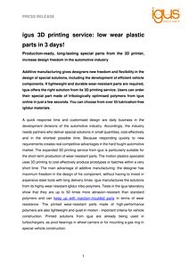 Additive manufacturing gives designers new freedom and flexibility in the design of special solutions, including the development of efficient vehicle components. If lightweight and durable wear-resistant parts are required, igus offers the right solution from its 3D printing service. Users can order their special part made of tribologically optimised polymers from igus online in just a few seconds. You can choose from over 55 lubrication-free iglidur materials.