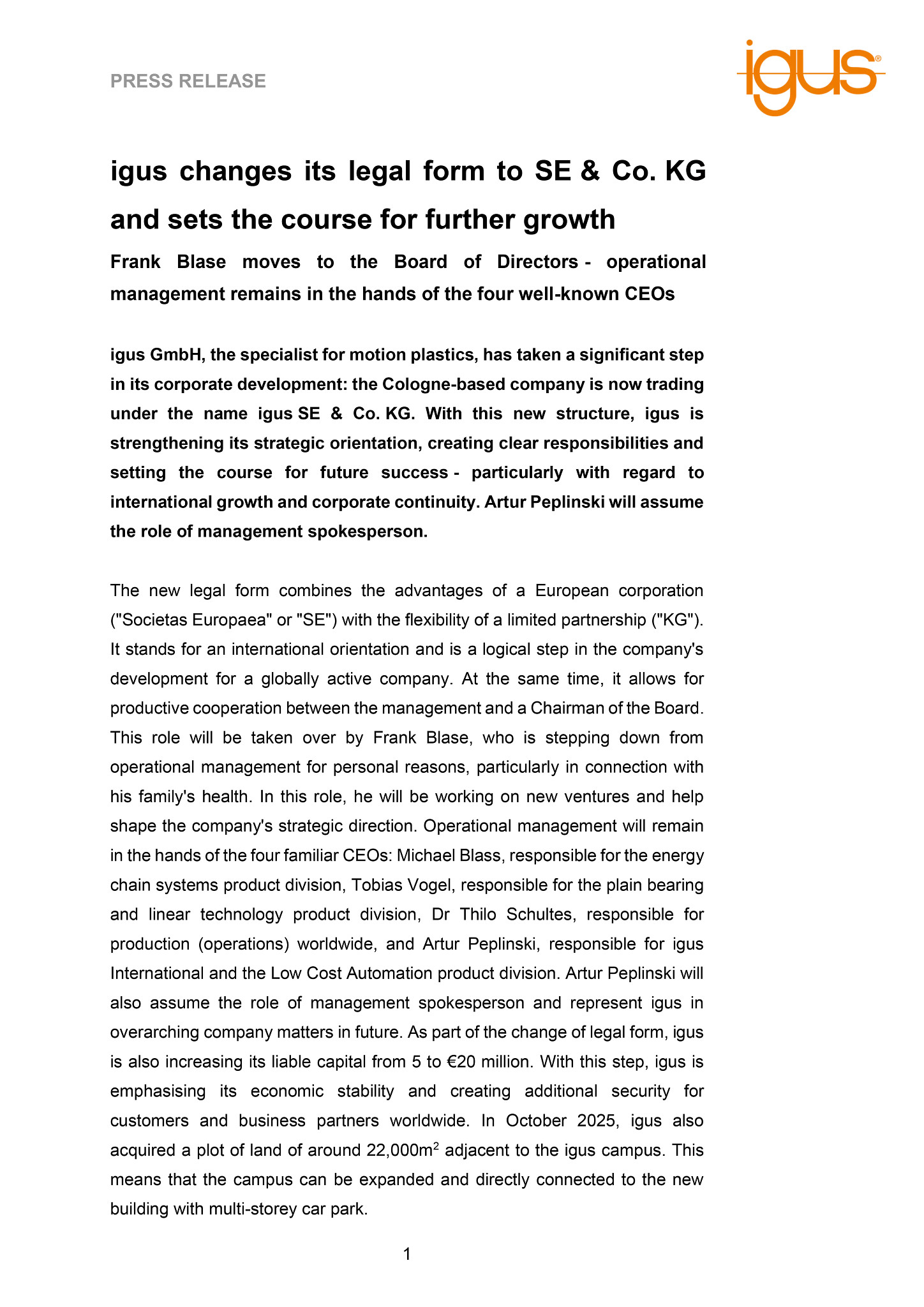 igus GmbH, the specialist for motion plastics, has taken a significant step in its corporate development: the Cologne-based company is now trading under the name igus SE & Co. KG. With this new structure, igus is strengthening its strategic orientation, creating clear responsibilities and setting the course for future success – particularly with regard to international growth and corporate continuity. Artur Peplinski will assume the role of management spokesperson.