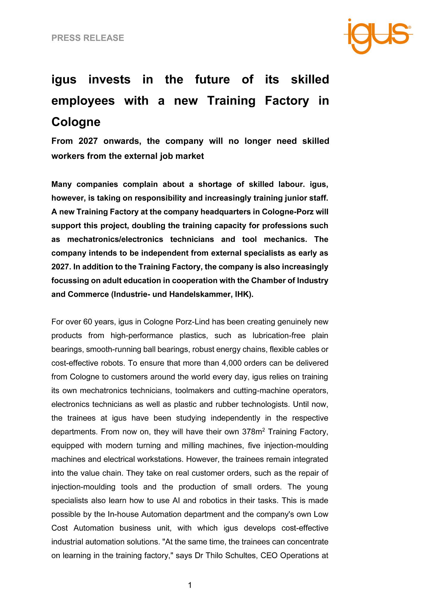 For over 60 years, igus in Cologne Porz-Lind has been creating genuinely new products from high-performance plastics, such as lubrication-free plain bearings, smooth-running ball bearings, robust energy chains, flexible cables or cost-effective robots. To ensure that more than 4,000 orders can be delivered from Cologne to customers around the world every day, igus relies on training its own mechatronics technicians, toolmakers and cutting-machine operators, electronics technicians as well as plastic and rubber technologists. Until now, the trainees at igus have been studying independently in the respective departments. From now on, they will have their own 378m2 Training Factory, equipped with modern turning and milling machines, five injection-moulding machines and electrical workstations. However, the trainees remain integrated into the value chain. They take on real customer orders, such as the repair of injection-moulding tools and the production of small orders. The young specialists also learn how to use AI and robotics in their tasks. This is made possible by the In-house Automation department and the company’s own Low Cost Automation business unit, with which igus develops cost-effective industrial automation solutions. “At the same time, the trainees can concentrate on learning in the training factory,” says Dr Thilo Schultes, CEO Operations at igus GmbH. “Learning together and regular dialogue strengthen the team spirit between trainees from different professions and their motivation.” After one and a half years in the Training Factory, the trainees move to their respective specialist departments. They have previously gained insights into them and can immediately take on responsible tasks.