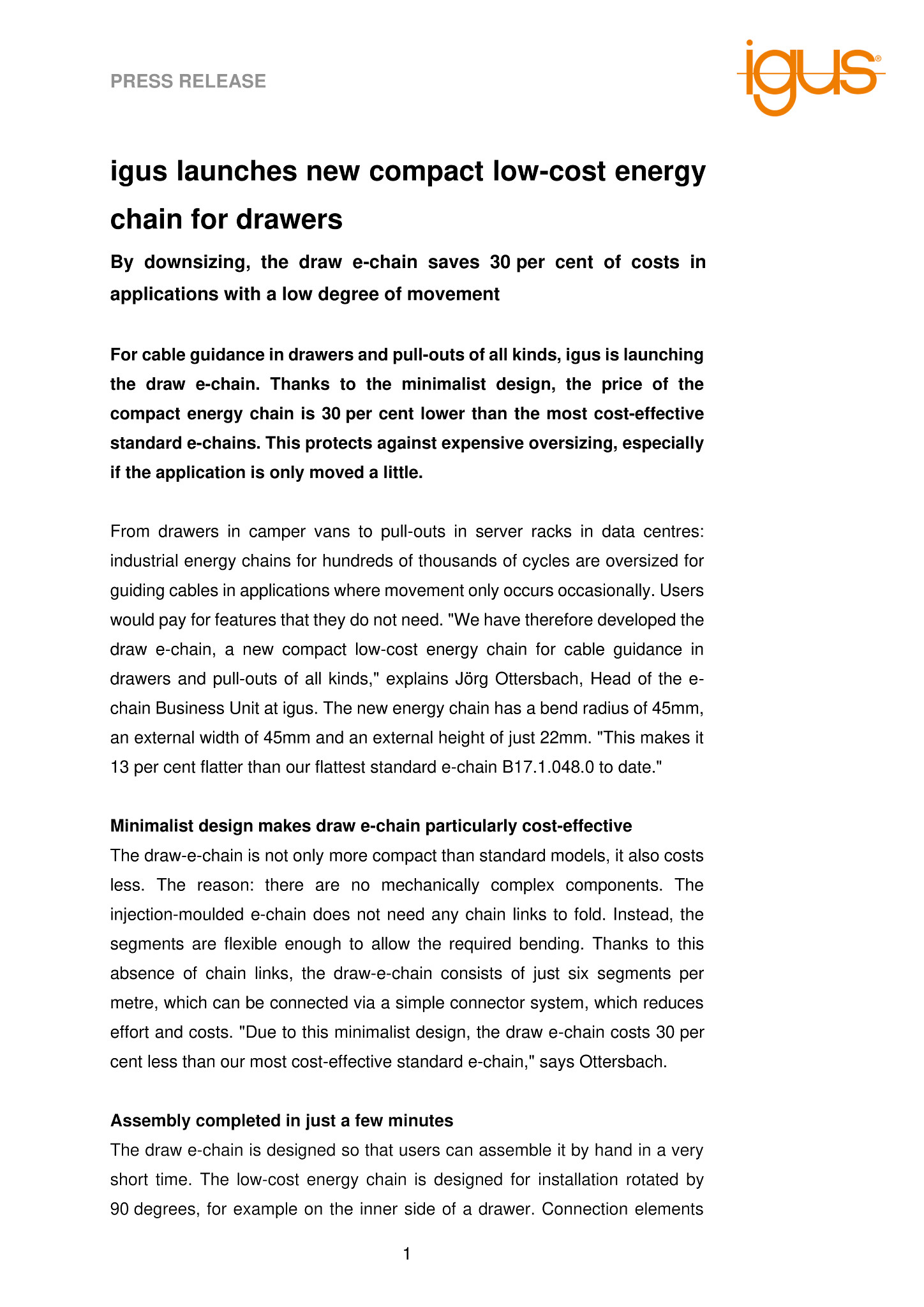 For cable guidance in drawers and pull-outs of all kinds, igus is launching the draw e-chain. Thanks to the minimalist design, the price of the compact energy chain is 30 per cent lower than the most cost-effective standard e-chains. This protects against expensive oversizing, especially if the application is only moved a little.