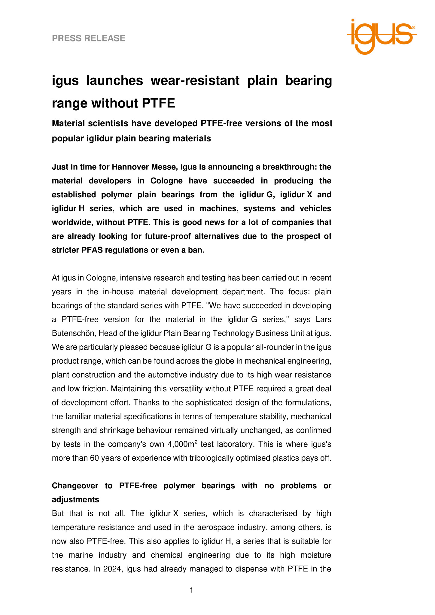Just in time for Hannover Messe, igus is announcing a breakthrough: the material developers in Cologne have succeeded in producing the established polymer plain bearings from the iglidur G, iglidur X and iglidur H series, which are used in machines, systems and vehicles worldwide, without PTFE. This is good news for a lot of companies that are already looking for future-proof alternatives due to the prospect of stricter PFAS regulations or even a ban.