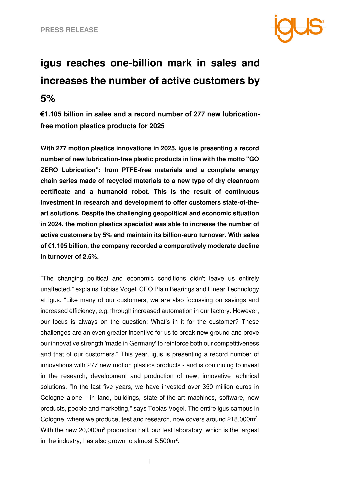 With 277 motion plastics innovations in 2025, igus is presenting a record number of new lubrication-free plastic products in line with the motto “GO ZERO Lubrication”: from PTFE-free materials and a complete energy chain series made of recycled materials to a new type of dry cleanroom certificate and a humanoid robot. This is the result of continuous investment in research and development to offer customers state-of-the-art solutions. Despite the challenging geopolitical and economic situation in 2024, the motion plastics specialist was able to increase the number of active customers by 5% and maintain its billion-euro turnover. With sales of €1.105 billion, the company recorded a comparatively moderate decline in turnover of 2.5%.