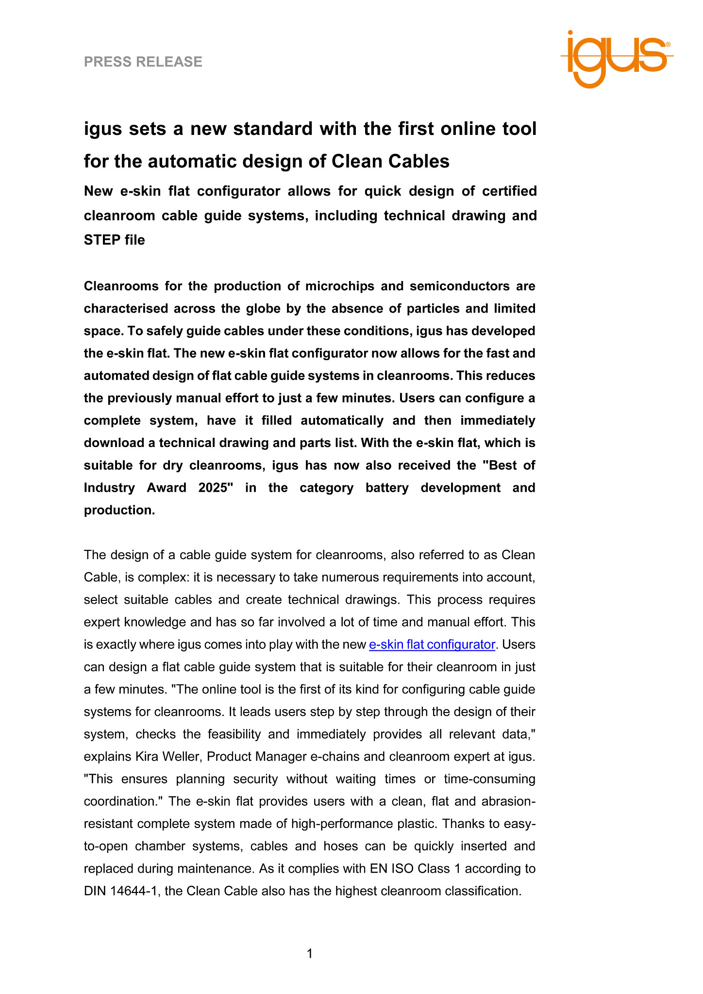 All relevant data is immediately available for download on the results page – from technical drawing to parts list to installation instructions. Customers can also download an additional STEP file. If the user is satisfied with the design, he/she can request a corresponding quotation and the igus experts carry out a final check of the configured system. “We wanted to make the configuration process for cleanroom cable guide systems as simple as possible,” says Weller. “With the new e-skin flat configurator, we are providing our customers with a complete package that allows them to continue design work immediately. Thanks to intelligent automation, we are able to significantly reduce the manual workload for both our customers and ourselves and maximise planning reliability.” e-skin flat has now also received the annual “Best of Industry Award 2025” from the trade magazine MM MaschinenMarkt in the category battery development and production. “We are delighted to receive this award, which is also an incentive for us to continue our development in this area,” emphasises Weller.