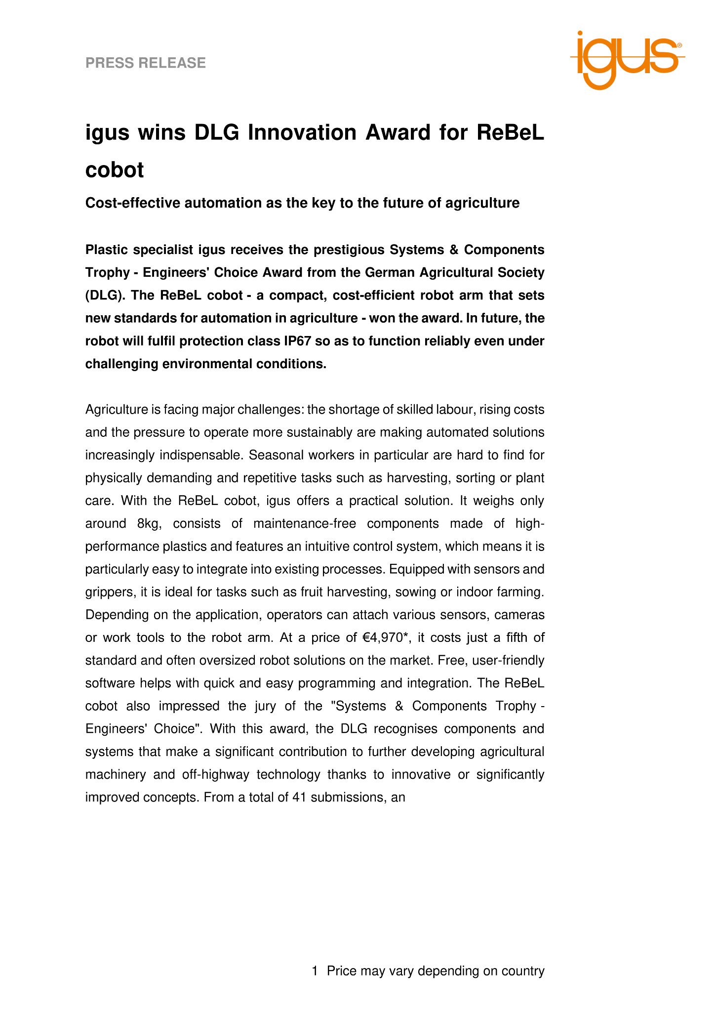 Agriculture is facing major challenges: the shortage of skilled labour, rising costs and the pressure to operate more sustainably are making automated solutions increasingly indispensable. Seasonal workers in particular are hard to find for physically demanding and repetitive tasks such as harvesting, sorting or plant care. With the ReBeL cobot, igus offers a practical solution. It weighs only around 8kg, consists of maintenance-free components made of high-performance plastics and features an intuitive control system, which means it is particularly easy to integrate into existing processes. Equipped with sensors and grippers, it is ideal for tasks such as fruit harvesting, sowing or indoor farming. Depending on the application, operators can attach various sensors, cameras or work tools to the robot arm. At a price of €4,970*, it costs just a fifth of standard and often oversized robot solutions on the market. Free, user-friendly software helps with quick and easy programming and integration. The ReBeL cobot also impressed the jury of the “Systems & Components Trophy – Engineers’ Choice”. With this award, the DLG recognises components and systems that make a significant contribution to further developing agricultural machinery and off-highway technology thanks to innovative or significantly improved concepts. From a total of 41 submissions, an expert jury directed by Prof. Dr. Till Meinel (TH Köln) selected the ReBeL as one of three winning projects.