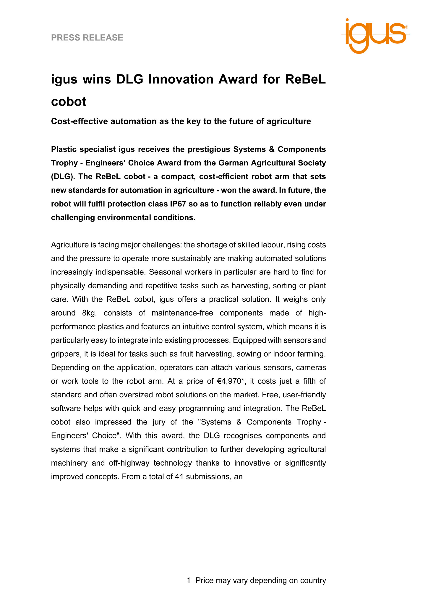 Plastic specialist igus receives the prestigious Systems & Components Trophy – Engineers’ Choice Award from the German Agricultural Society (DLG). The ReBeL cobot – a compact, cost-efficient robot arm that sets new standards for automation in agriculture – won the award. In future, the robot will fulfil protection class IP67 so as to function reliably even under challenging environmental conditions.