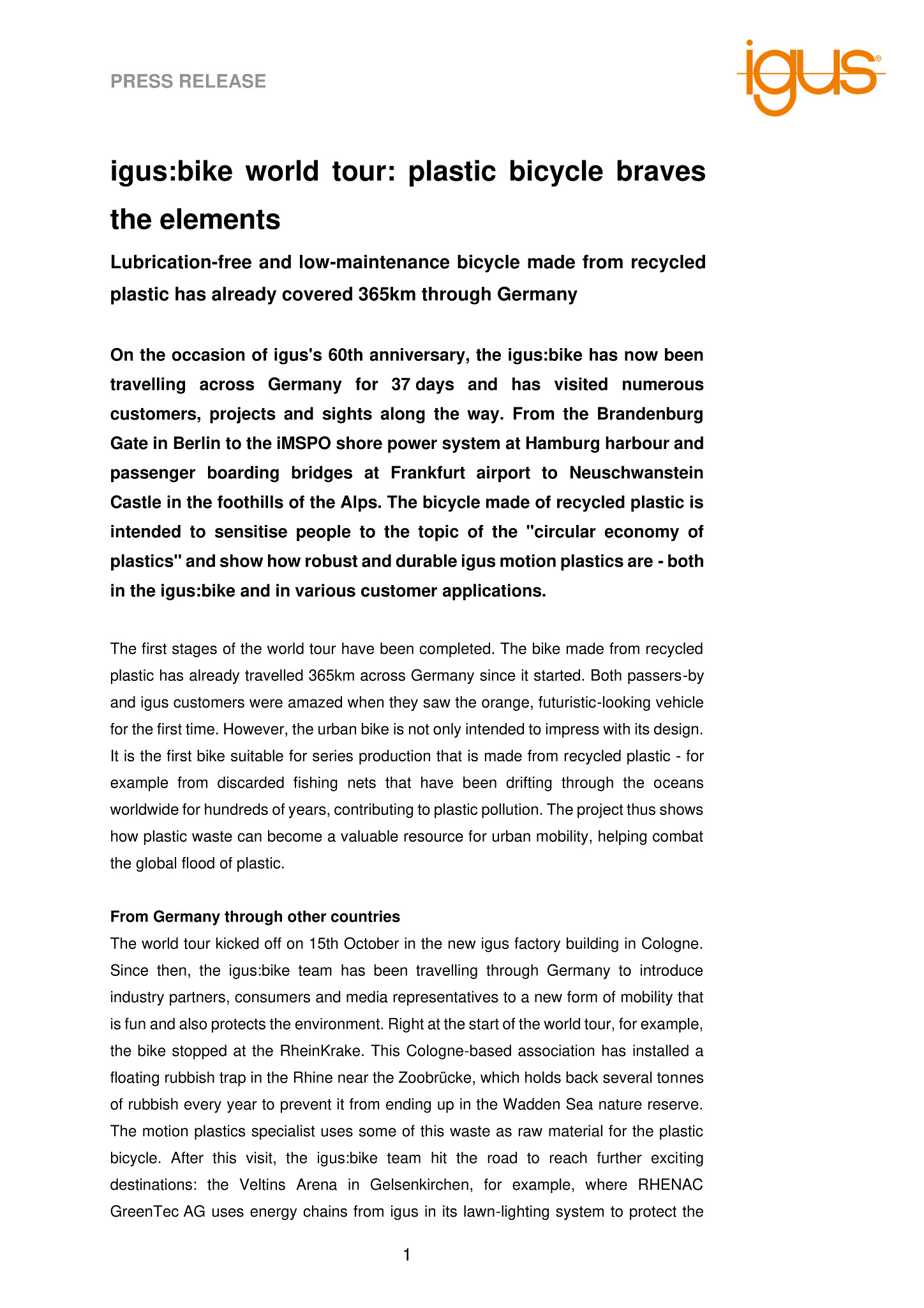 The world tour kicked off on 15th October in the new igus factory building in Cologne. Since then, the igus:bike team has been travelling through Germany to introduce industry partners, consumers and media representatives to a new form of mobility that is fun and also protects the environment. Right at the start of the world tour, for example, the bike stopped at the RheinKrake. This Cologne-based association has installed a floating rubbish trap in the Rhine near the Zoobrücke, which holds back several tonnes of rubbish every year to prevent it from ending up in the Wadden Sea nature reserve. The motion plastics specialist uses some of this waste as raw material for the plastic bicycle. After this visit, the igus:bike team hit the road to reach further exciting destinations: the Veltins Arena in Gelsenkirchen, for example, where RHENAC GreenTec AG uses energy chains from igus in its lawn-lighting system to protect the outdoor facility’s energy and data cables from UV radiation, rain and temperature fluctuations. Or the Eurogate Container Terminal at the Port of Hamburg, where the igus Mobile Shore Power Outlet supplies container ships with shore power quickly and flexibly. And of course cycling through the Brandenburg Gate in Berlin was a must. The bike is now crossing the German border, making its way to the next stage: Singapore. The urban bike makes is stopping in various countries around the world, including Austria, Italy, Spain, the USA and Japan. It will cover 6,000km during the tour and prove how robust the high-performance plastics from igus are.