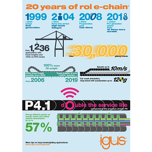 From technical innovation and the standard up to a far-sighted solution: this characterises the evolution of igus roller energy chains. For more than 45 years, the motion plastics specialist has been developing energy supply systems that reliably guide cables for all media – such as Ethernet, servo, motor – as well as hoses. In the beginning, they were almost exclusively products for the mechanical engineering sector, the invention of the rol energy chain more than 20 years ago brought about the breakthrough into other branches of industry. The technical basis is the integration of rollers into the chain links to enormously reduce the coefficient of friction on long travels. The infographic explains how much energy can be saved and what speeds can be achieved with the roller energy chains.