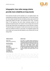 From technical innovation and the standard up to a far-sighted solution: this characterises the evolution of igus roller energy chains. For more than 45 years, the motion plastics specialist has been developing energy supply systems that reliably guide cables for all media – such as Ethernet, servo, motor – as well as hoses. In the beginning, they were almost exclusively products for the mechanical engineering sector, the invention of the rol energy chain more than 20 years ago brought about the breakthrough into other branches of industry. The technical basis is the integration of rollers into the chain links to enormously reduce the coefficient of friction on long travels. The infographic explains how much energy can be saved and what speeds can be achieved with the roller energy chains.