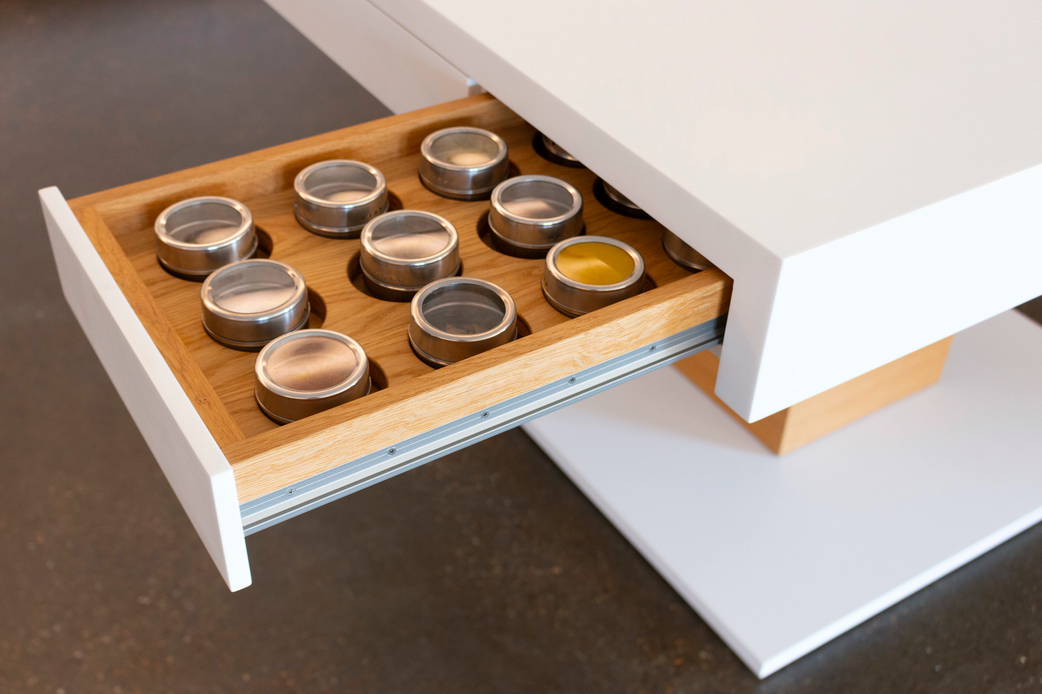 When choosing the drylin WSQ linear system, one decisive criterion was not only the functionality – the wear-resistant and long-lasting opening and closing of the drawers – but also the processing of the rails. “The combination of the aluminium of the rail and the oak of the cube complements one another, which was very important to me. Just like the square shape of the guide”, explains Pracht. Each of the five drawers contains two guides. Liners made of the high-performance iglidur J200 polymer ensure smooth operation. It is lubrication-free and maintenance-free, thanks to the use of solid lubricants. A great advantage in potential contact with food. Furthermore, dirt and dust cannot adhere to the bearings. The guides and bearings are easy to clean with household chemicals. An all-round hygienic solution.