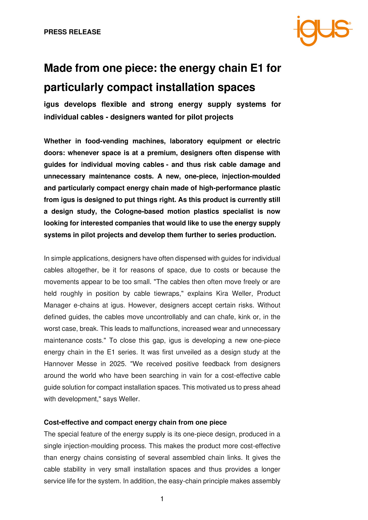 In simple applications, designers have often dispensed with guides for individual cables altogether, be it for reasons of space, due to costs or because the movements appear to be too small. “The cables then often move freely or are held roughly in position by cable tiewraps,” explains Kira Weller, Product Manager e-chains at igus. However, designers accept certain risks. Without defined guides, the cables move uncontrollably and can chafe, kink or, in the worst case, break. This leads to malfunctions, increased wear and unnecessary maintenance costs.” To close this gap, igus is developing a new one-piece energy chain in the E1 series. It was first unveiled as a design study at the Hannover Messe in 2025. “We received positive feedback from designers around the world who have been searching in vain for a cost-effective cable guide solution for compact installation spaces. This motivated us to press ahead with development,” says Weller.