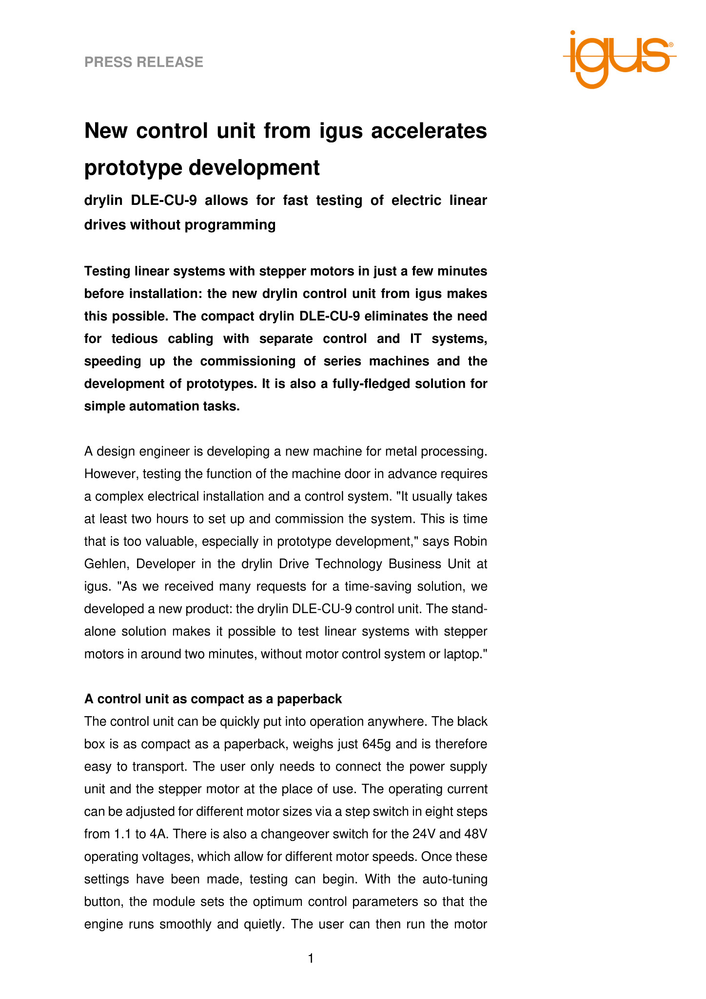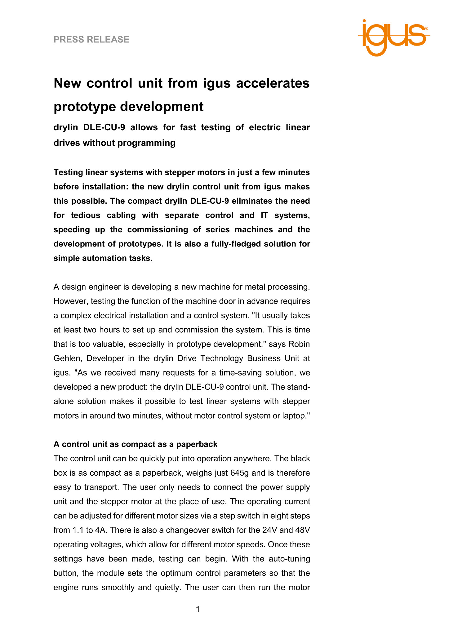 A design engineer is developing a new machine for metal processing. However, testing the function of the machine door in advance requires a complex electrical installation and a control system. “It usually takes at least two hours to set up and commission the system. This is time that is too valuable, especially in prototype development,” says Robin Gehlen, Developer in the drylin Drive Technology Business Unit at igus. “As we received many requests for a time-saving solution, we developed a new product: the drylin DLE-CU-9 control unit. The stand-alone solution makes it possible to test linear systems with stepper motors in around two minutes, without motor control system or laptop.”