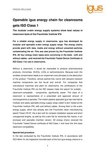 For a reliable energy supply in cleanrooms, igus has developed its modular and openable e-skin energy supply range. The energy chains provide plant with data, media and energy without unwanted particles contaminating the air. This was also proven by the Fraunhofer Institute IPA. All four energy chain types were convincing in the tests – with and without cables – and received the Fraunhofer Tested Device Certificate of ISO Class 1 for use in cleanrooms.