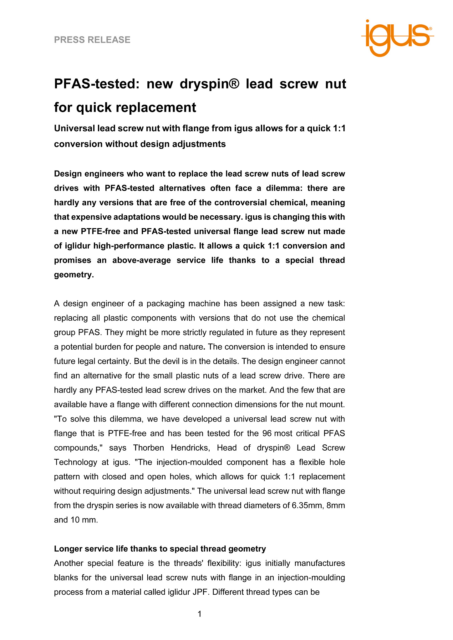 PFAS-tested: new dryspin® lead screw nut for quick replacement