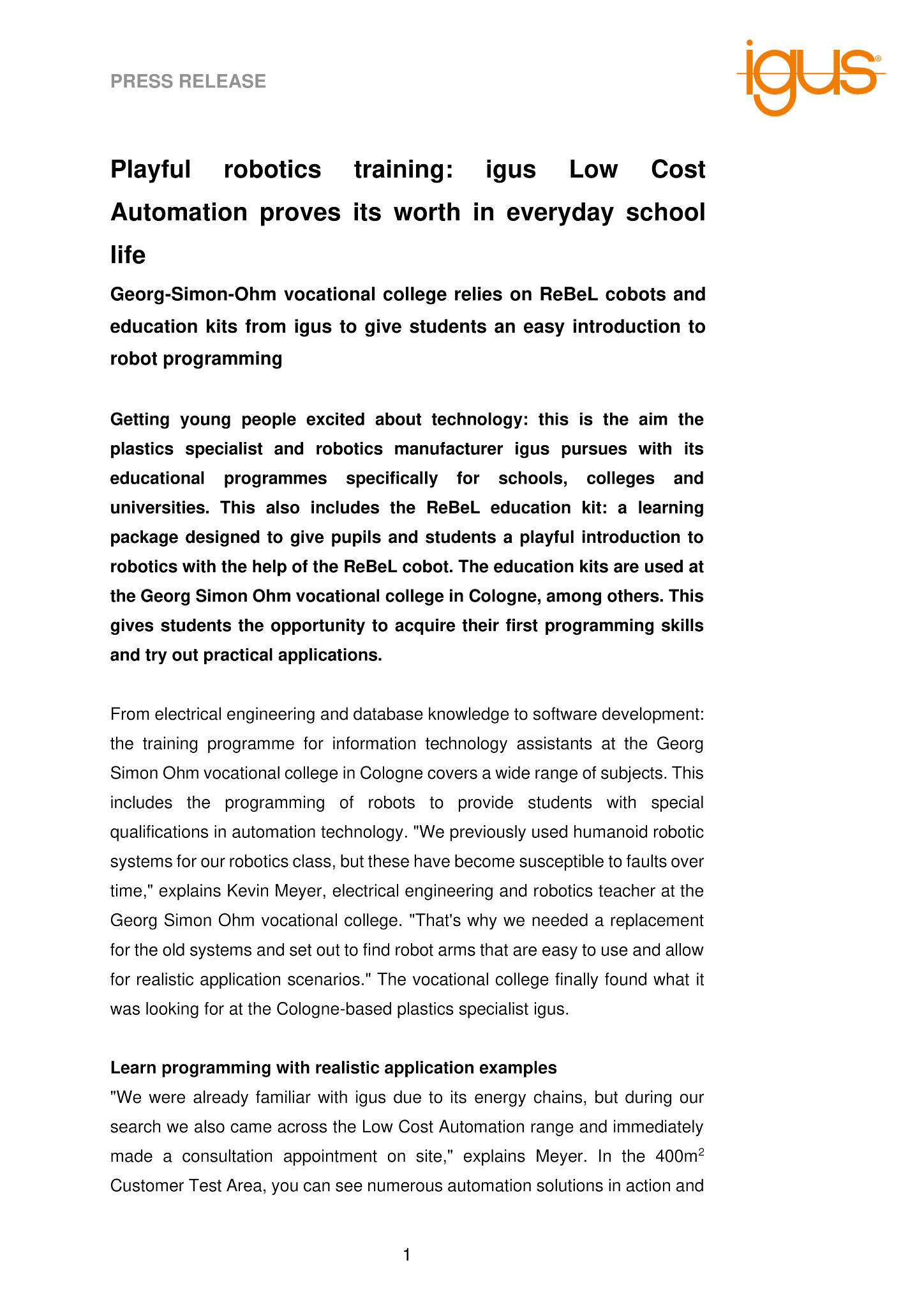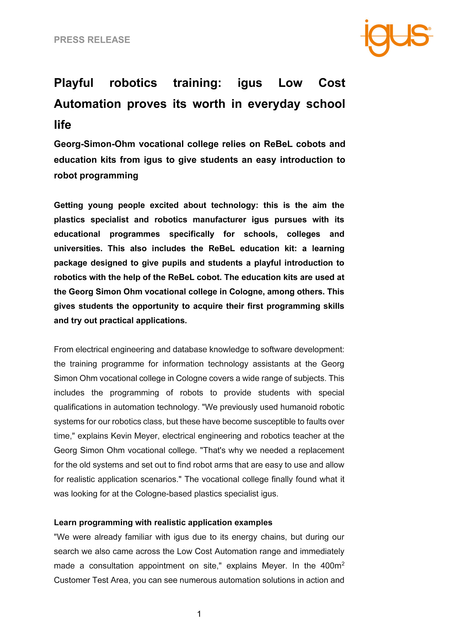 Georg-Simon-Ohm vocational college relies on ReBeL cobots and education kits from igus to give students an easy introduction to robot programming