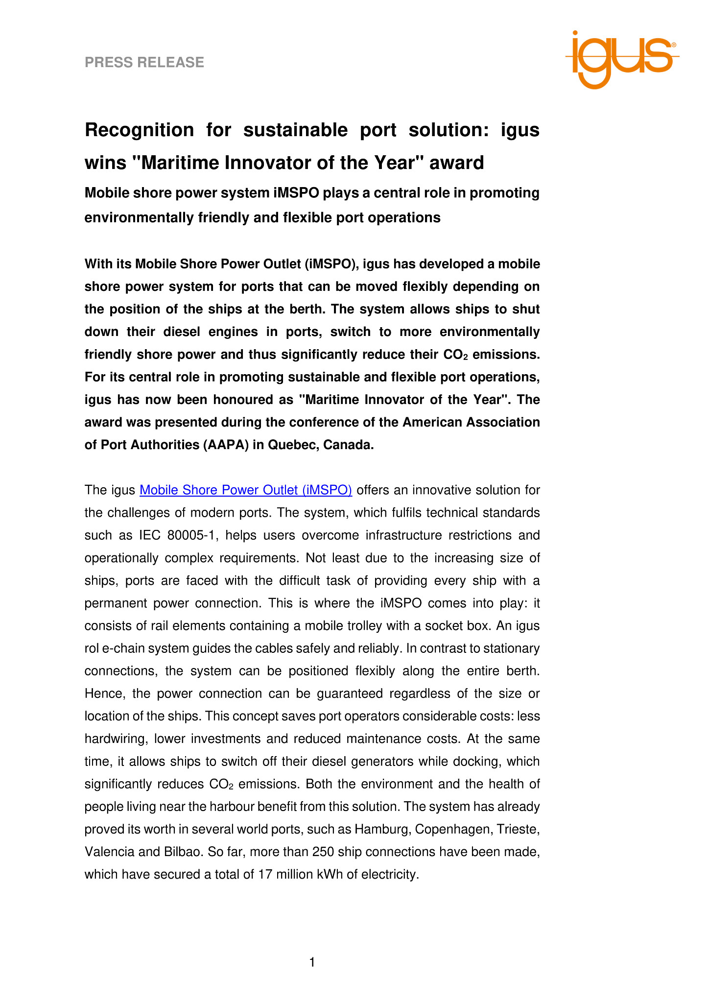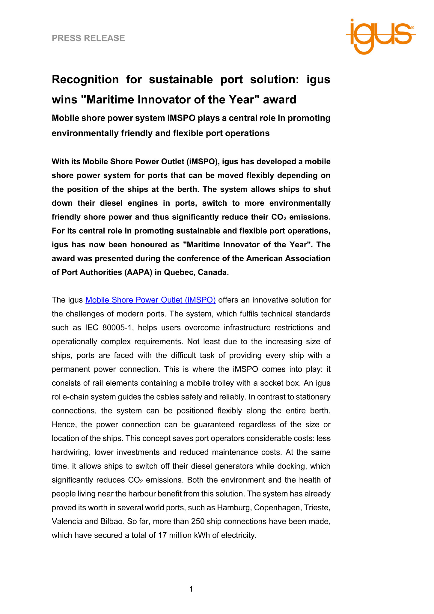With its Mobile Shore Power Outlet (iMSPO), igus has developed a mobile shore power system for ports that can be moved flexibly depending on the position of the ships at the berth. The system allows ships to shut down their diesel engines in ports, switch to more environmentally friendly shore power and thus significantly reduce their CO2 emissions. For its central role in promoting sustainable and flexible port operations, igus has now been honoured as “Maritime Innovator of the Year”. The award was presented during the conference of the American Association of Port Authorities (AAPA) in Quebec, Canada.