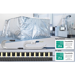 The “Pre-aging” certificate, which was commissioned for the e-skin soft and easy chain E14 energy supply systems, certifies the systems after 15 million double strokes and 10 months in the dry room. Here too, the igus e-chains received the best possible ISO Class 4 certification. Thanks to these long-term studies and certifications from the Fraunhofer IPA, igus was able to confirm that the energy supply systems have very low particle emissions and are therefore safe for automation in the dry cleanroom.