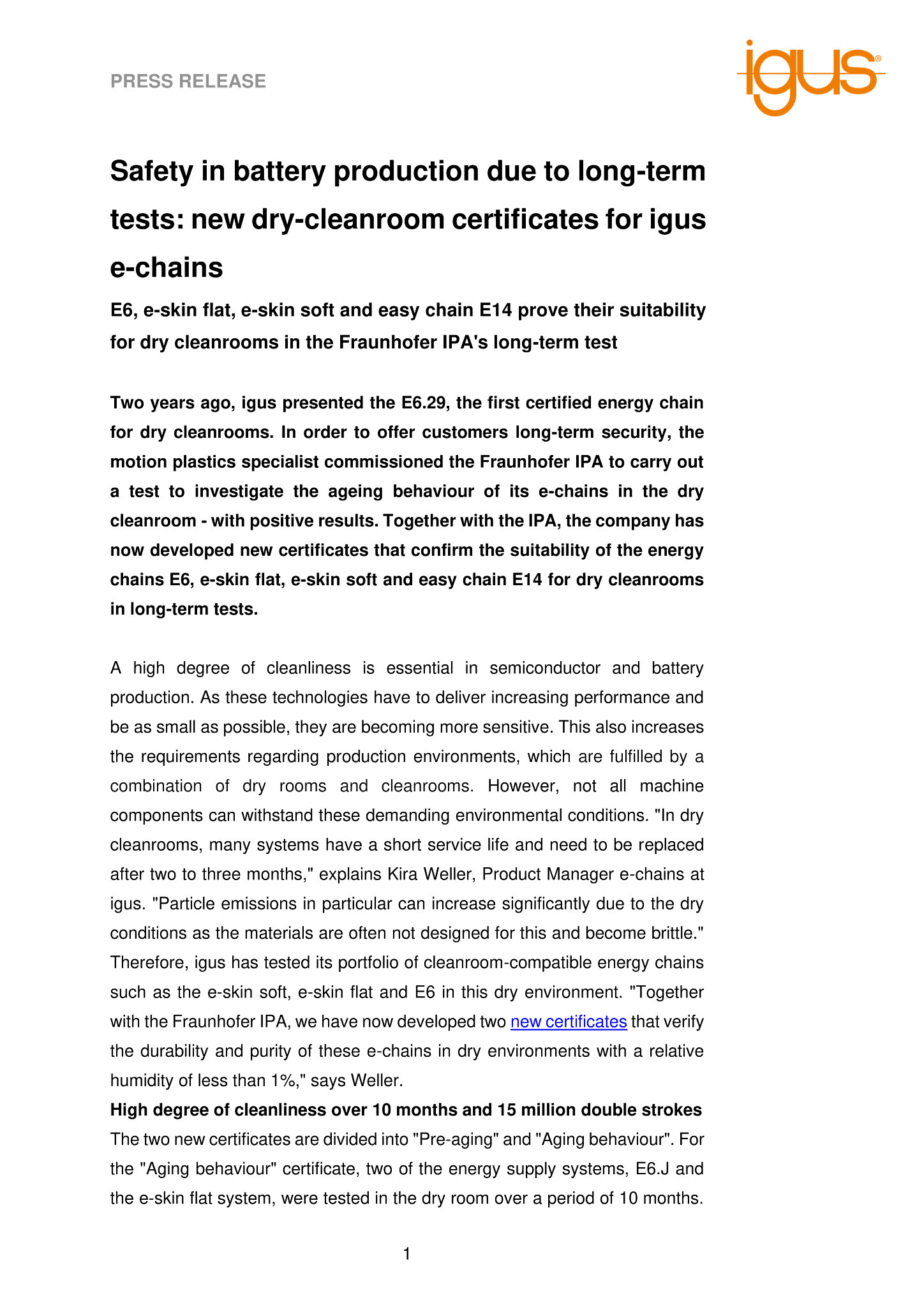 A high degree of cleanliness is essential in semiconductor and battery production. As these technologies have to deliver increasing performance and be as small as possible, they are becoming more sensitive. This also increases the requirements regarding production environments, which are fulfilled by a combination of dry rooms and cleanrooms. However, not all machine components can withstand these demanding environmental conditions. “In dry cleanrooms, many systems have a short service life and need to be replaced after two to three months,” explains Kira Weller, Product Manager e-chains at igus. “Particle emissions in particular can increase significantly due to the dry conditions as the materials are often not designed for this and become brittle.” Therefore, igus has tested its portfolio of cleanroom-compatible energy chains such as the e-skin soft, e-skin flat and E6 in this dry environment. “Together with the Fraunhofer IPA, we have now developed two new certificates that verify the durability and purity of these e-chains in dry environments with a relative humidity of less than 1%,” says Weller.