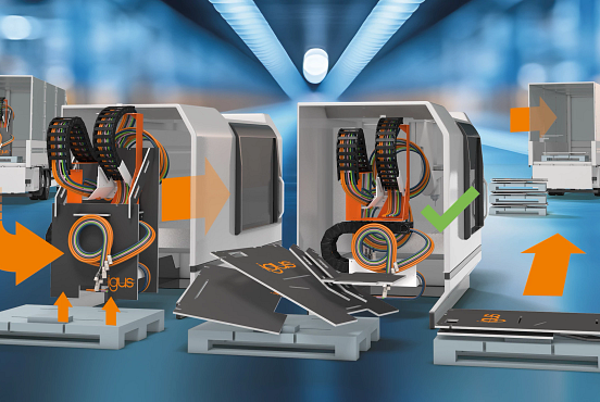 The eco-rack is another building block with which igus is making the readychain service more sustainable as customers receive energy chains that are ready for connection. All cables from the in-house chainflex range are already laid and fitted with plug connections, and sensors for predictive maintenance are already installed. This not only reduces assembly time by up to 75%, but also minimises preparation time. “Customers no longer have to combine numerous components from different manufacturers, but can get everything from a single source with just one part number,” says Hüffel. The system also relieves transport logistics. “As all required parts are delivered in one package, the number of individual transports is significantly reduced, which results in less traffic.” The readychain service is now available at 13 locations around the world. Every week, 400 harnessed energy chain systems leave the readychain factory in Cologne. Thanks to a high degree of automation in production, igus can offer customised harnessing economically with no minimum order quantity.