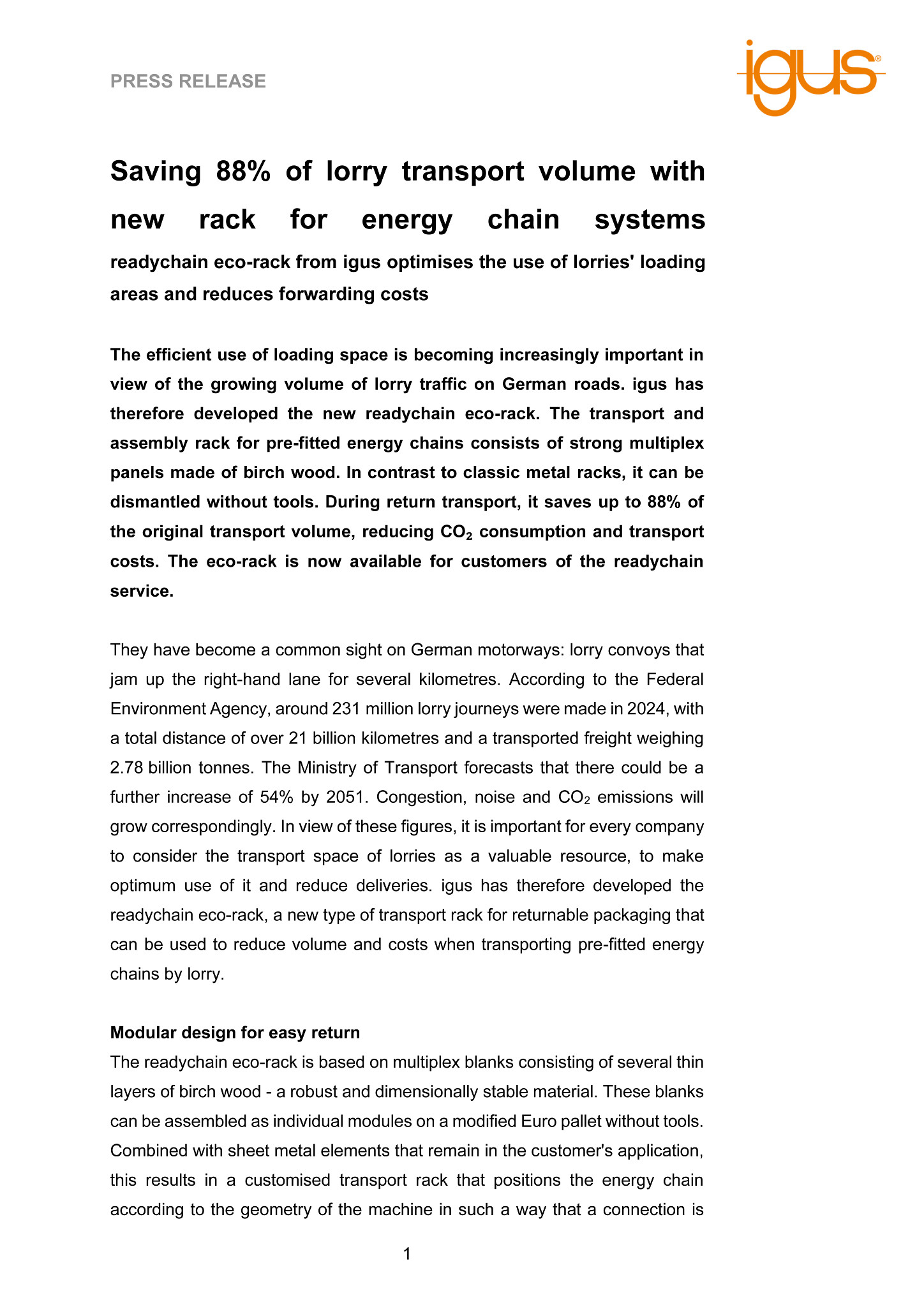 They have become a common sight on German motorways: lorry convoys that jam up the right-hand lane for several kilometres. According to the Federal Environment Agency, around 231 million lorry journeys were made in 2024, with a total distance of over 21 billion kilometres and a transported freight weighing 2.78 billion tonnes. The Ministry of Transport forecasts that there could be a further increase of 54% by 2051. Congestion, noise and CO2 emissions will grow correspondingly. In view of these figures, it is important for every company to consider the transport space of lorries as a valuable resource, to make optimum use of it and reduce deliveries. igus has therefore developed the readychain eco-rack, a new type of transport rack for returnable packaging that can be used to reduce volume and costs when transporting pre-fitted energy chains by lorry.