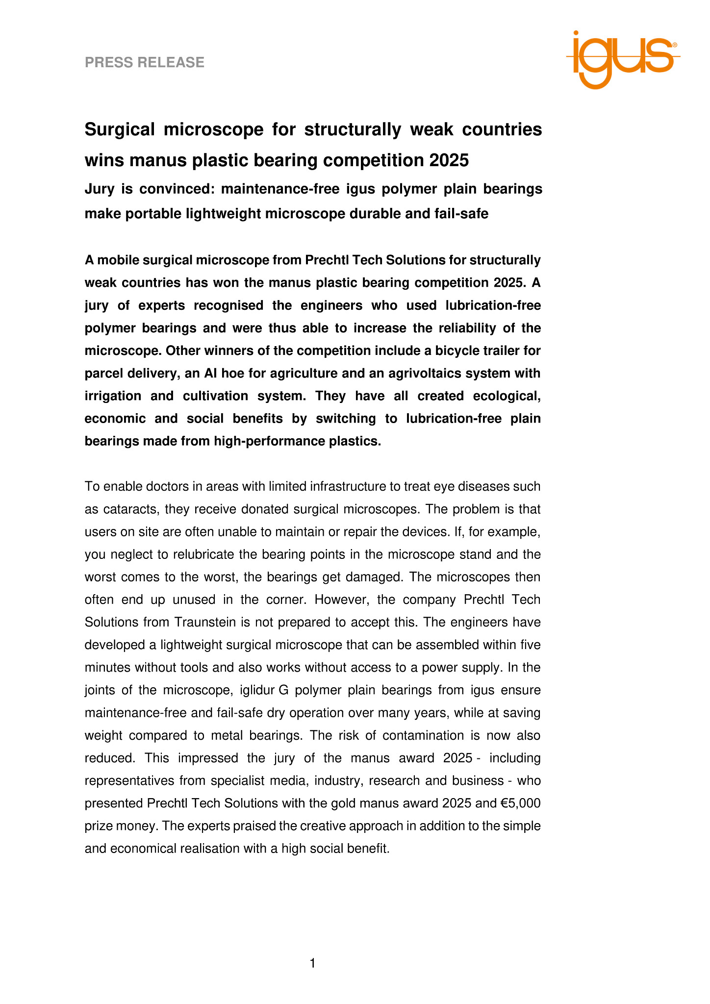 To enable doctors in areas with limited infrastructure to treat eye diseases such as cataracts, they receive donated surgical microscopes. The problem is that users on site are often unable to maintain or repair the devices. If, for example, you neglect to relubricate the bearing points in the microscope stand and the worst comes to the worst, the bearings get damaged. The microscopes then often end up unused in the corner. However, the company Prechtl Tech Solutions from Traunstein is not prepared to accept this. The engineers have developed a lightweight surgical microscope that can be assembled within five minutes without tools and also works without access to a power supply. In the joints of the microscope, iglidur G polymer plain bearings from igus ensure maintenance-free and fail-safe dry operation over many years, while at saving weight compared to metal bearings. The risk of contamination is now also reduced. This impressed the jury of the manus award 2025 – including representatives from specialist media, industry, research and business – who presented Prechtl Tech Solutions with the gold manus award 2025 and €5,000 prize money. The experts praised the creative approach in addition to the simple and economical realisation with a high social benefit.