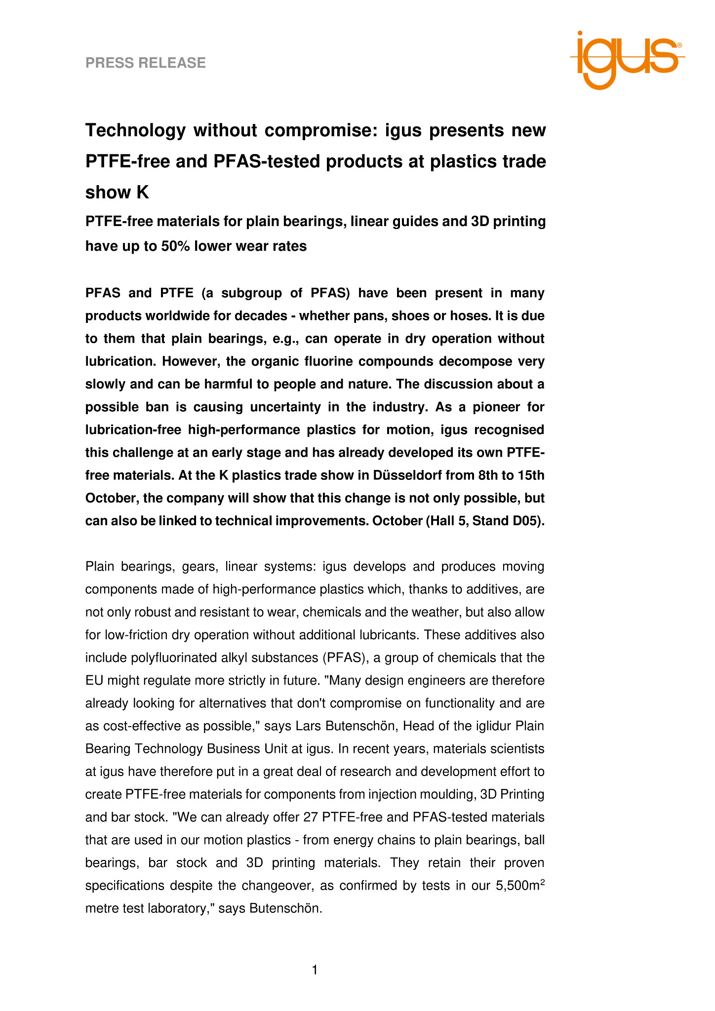 PFAS and PTFE (a subgroup of PFAS) have been present in many products worldwide for decades – whether pans, shoes or hoses. It is due to them that plain bearings, e.g., can operate in dry operation without lubrication. However, the organic fluorine compounds decompose very slowly and can be harmful to people and nature. The discussion about a possible ban is causing uncertainty in the industry. As a pioneer for lubrication-free high-performance plastics for motion, igus recognised this challenge at an early stage and has already developed its own PTFE-free materials. At the K plastics trade show in Düsseldorf from 8th to 15th October, the company will show that this change is not only possible, but can also be linked to technical improvements. October (Hall 5, Stand D05).