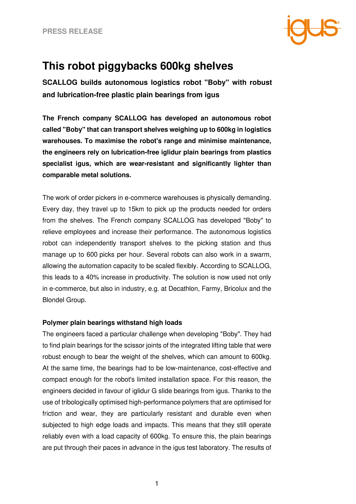 The French company SCALLOG has developed an autonomous robot called “Boby” that can transport shelves weighing up to 600kg in logistics warehouses. To maximise the robot’s range and minimise maintenance, the engineers rely on lubrication-free iglidur plain bearings from plastics specialist igus, which are wear-resistant and significantly lighter than comparable metal solutions.