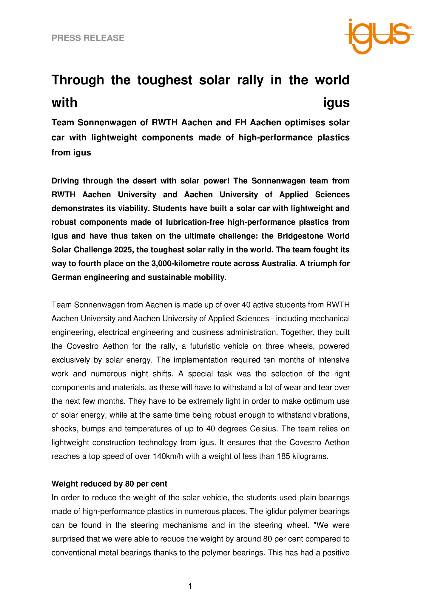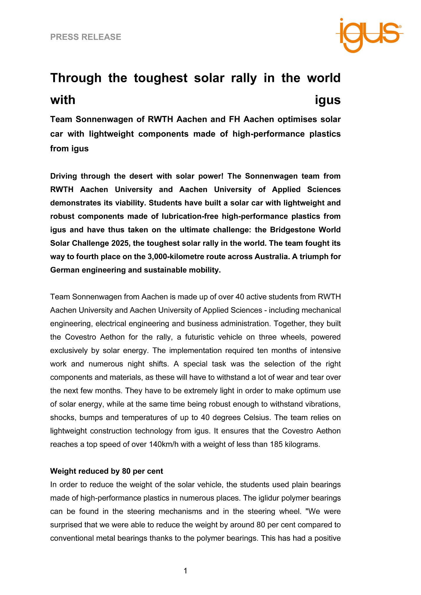Driving through the desert with solar power! The Sonnenwagen team from RWTH Aachen University and Aachen University of Applied Sciences demonstrates its viability. Students have built a solar car with lightweight and robust components made of lubrication-free high-performance plastics from igus and have thus taken on the ultimate challenge: the Bridgestone World Solar Challenge 2025, the toughest solar rally in the world. The team fought its way to fourth place on the 3,000-kilometre route across Australia. A triumph for German engineering and sustainable mobility.