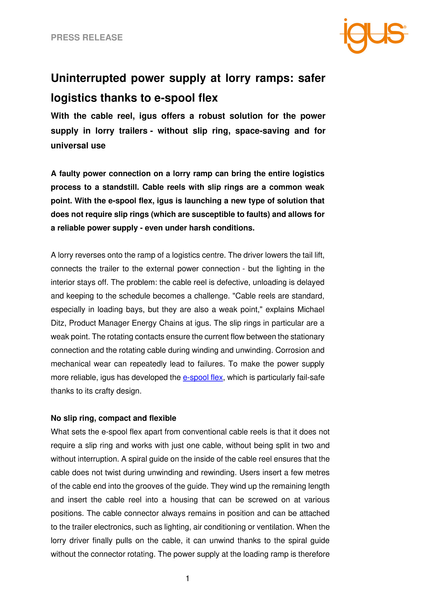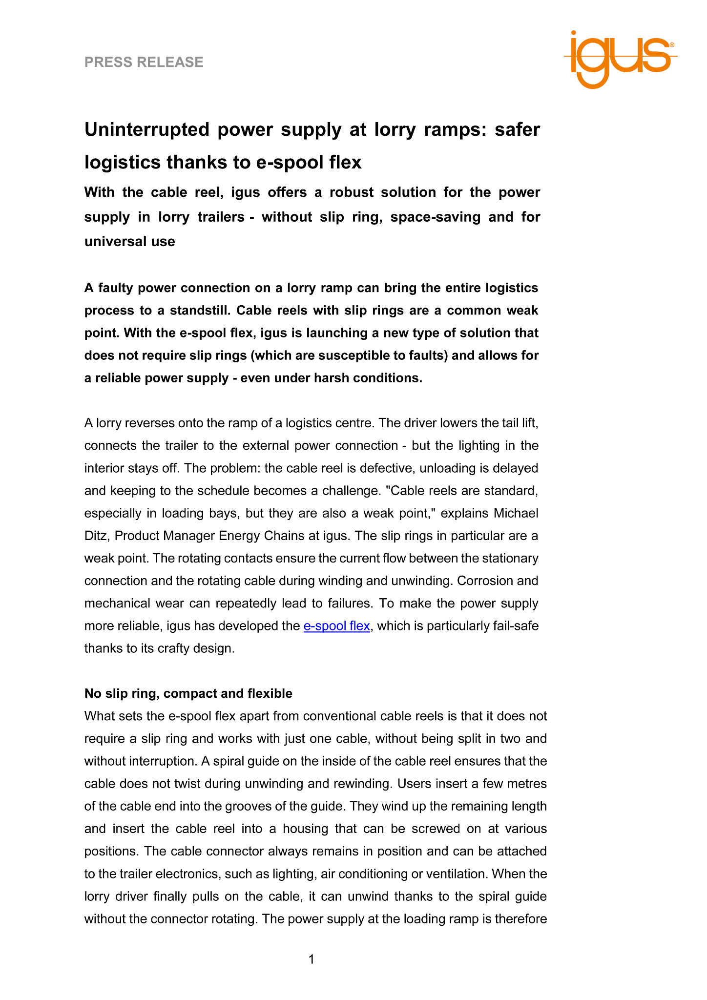 A faulty power connection on a lorry ramp can bring the entire logistics process to a standstill. Cable reels with slip rings are a common weak point. With the e-spool flex, igus is launching a new type of solution that does not require slip rings (which are susceptible to faults) and allows for a reliable power supply – even under harsh conditions.