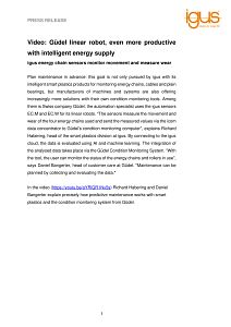 Among them is Swiss company Güdel: the automation specialist uses the igus sensors EC.M and EC.W for its linear robots. “The sensors measure the movement and wear of the four energy chains used and send the measured values via the icom data concentrator to Güdel’s condition monitoring computer”, explains Richard Habering, head of the smart plastics division at igus. By connecting to the igus cloud, the data is evaluated using AI and machine learning. The integration of the analysed data takes place via the Güdel Condition Monitoring System. “With the tool, the user can monitor the status of the energy chains and rollers in use”, says Daniel Bangerter, head of customer care at Güdel. “Maintenance can be planned by collecting and evaluating the data.”