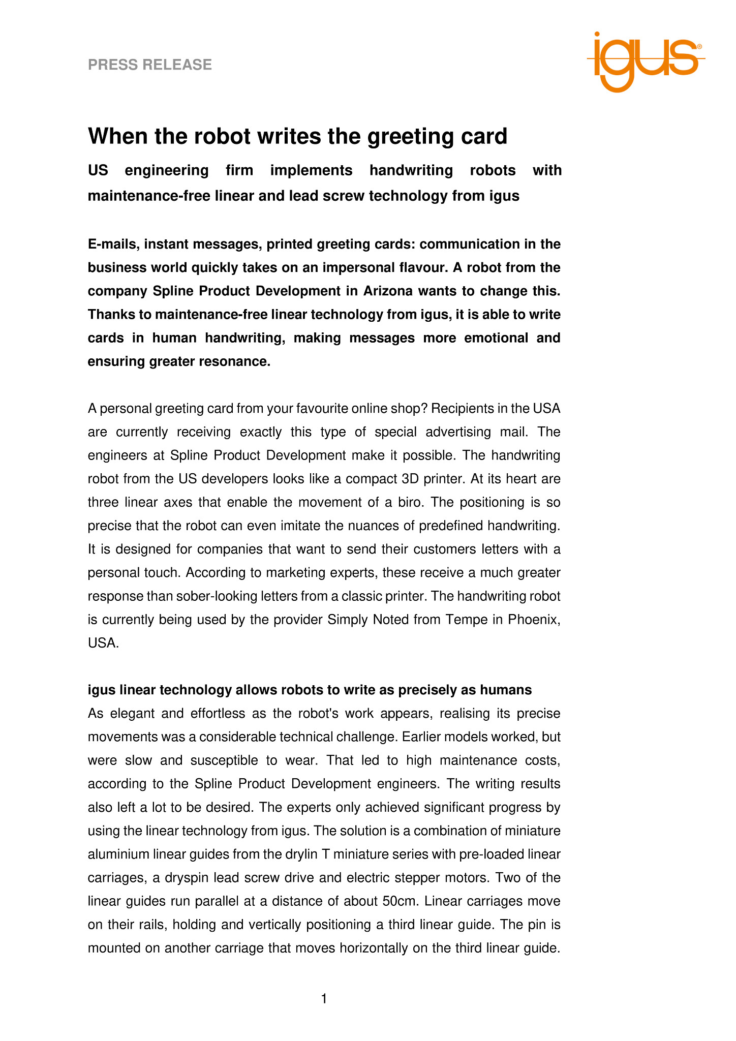 E-mails, instant messages, printed greeting cards: communication in the business world quickly takes on an impersonal flavour. A robot from the company Spline Product Development in Arizona wants to change this. Thanks to maintenance-free linear technology from igus, it is able to write cards in human handwriting, making messages more emotional and ensuring greater resonance.