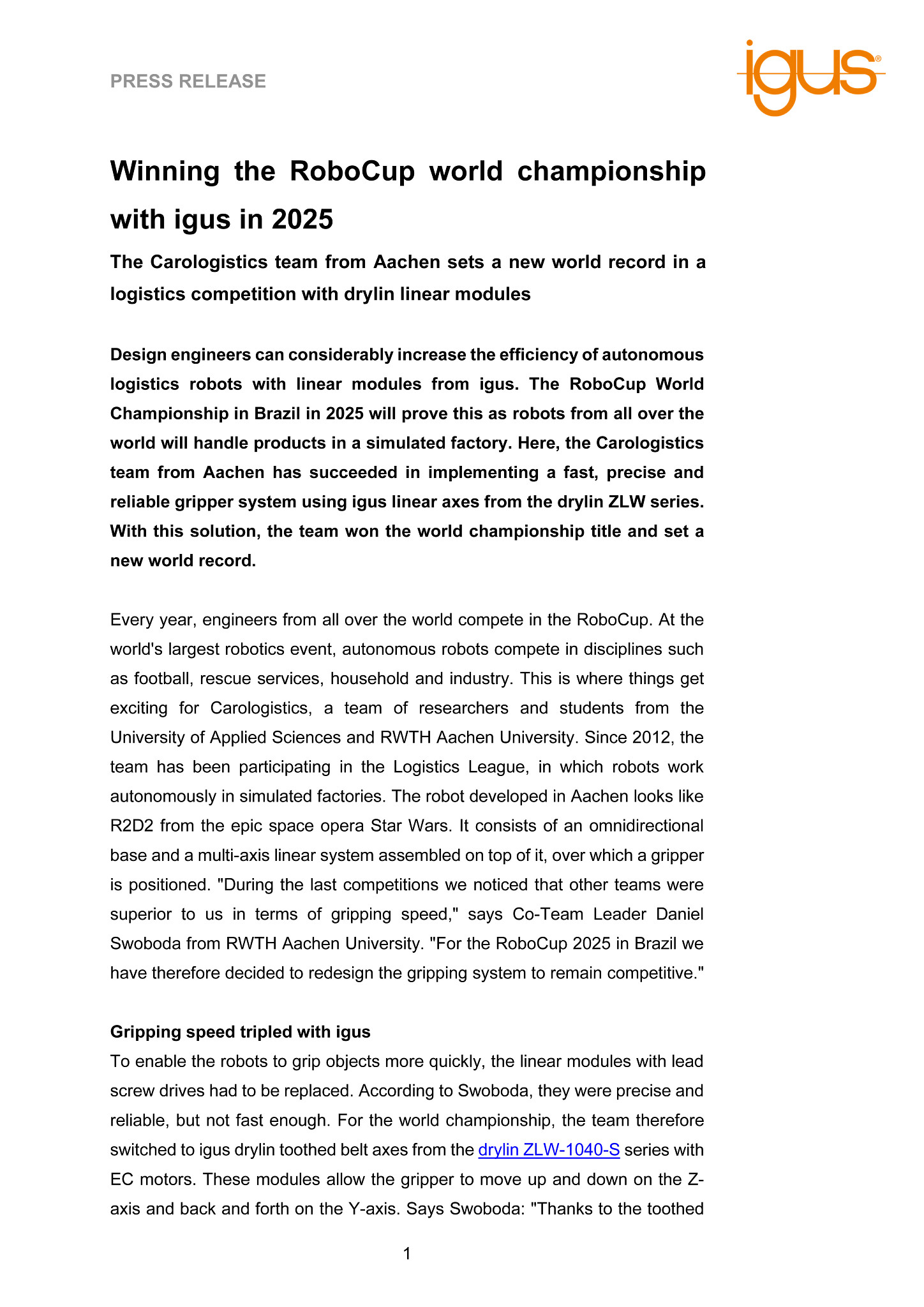 Design engineers can considerably increase the efficiency of autonomous logistics robots with linear modules from igus. The RoboCup World Championship in Brazil in 2025 will prove this as robots from all over the world will handle products in a simulated factory. Here, the Carologistics team from Aachen has succeeded in implementing a fast, precise and reliable gripper system using igus linear axes from the drylin ZLW series. With this solution, the team won the world championship title and set a new world record.
